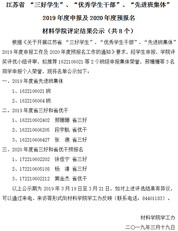 公示|材料学院评定结果公示--江苏省“三好学生”、“优秀学生干部”、“先进班集体”2019年度申报及2020年度预报名