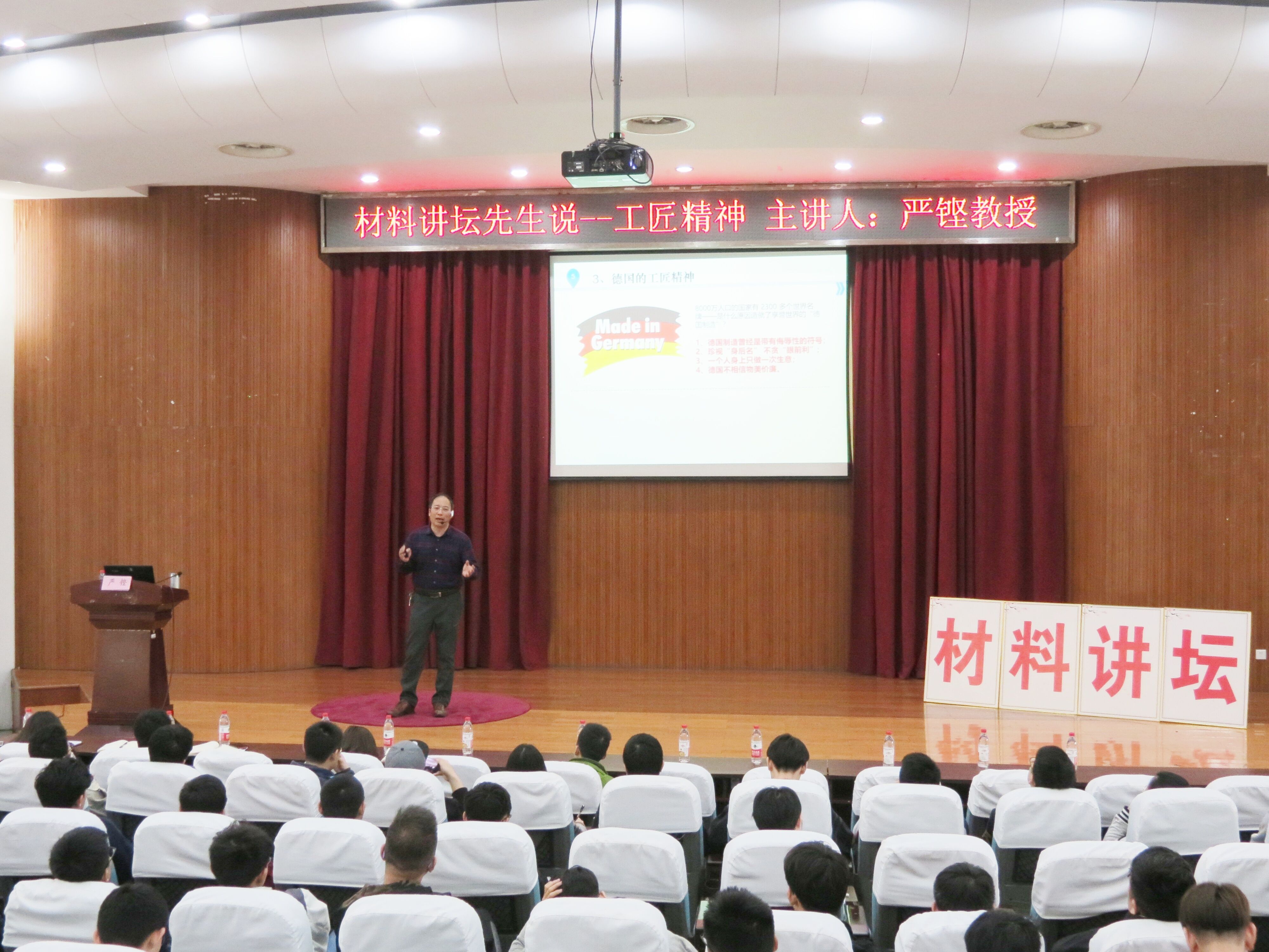 3月28日下午,由材料学院组织的“材料讲坛先生说——工匠精神”知识讲座在西校区学术报告区如期进行。讲座特邀材料学院知名教授严铿担任主讲人。学院学业导师、辅导员和18级全体学生一起聆听讲座。
