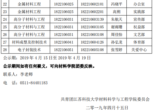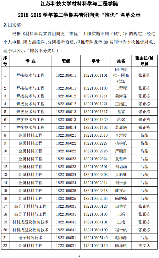 团推优|材料学院2018-2019学年第二学期共青团向党“推优”名单公示