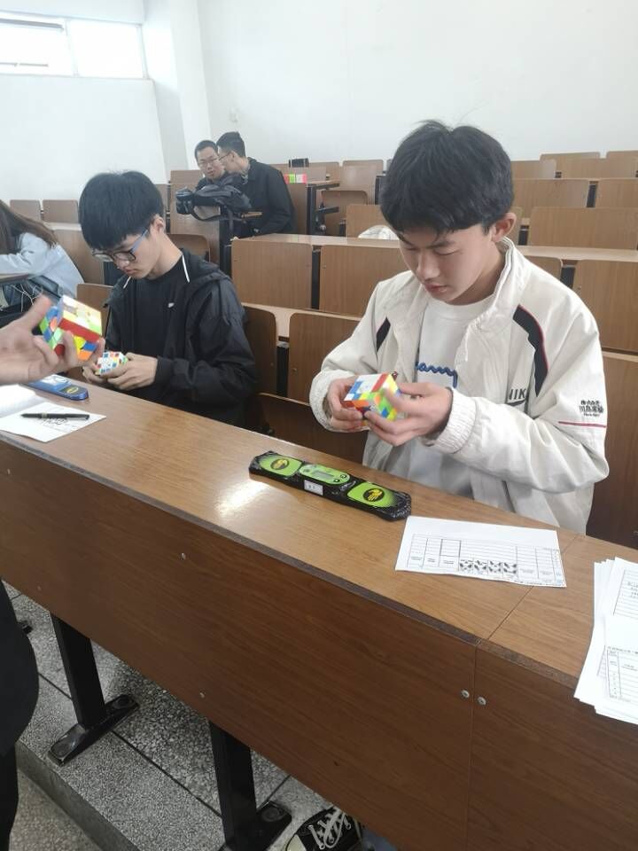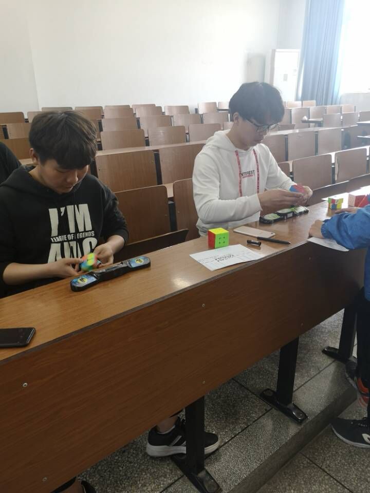 下午两点,各参赛队伍来到江苏科技大学西综322进行准备。比赛开始后,首先进行的是魔方三阶还原项目。比赛中各组的成员们不甘落后,你追我赶,教室里处处是成员们舞动指尖的声音。由主办方派出的郭凌云负责记录各组成员的成绩,保证比赛公平公正。随后依次进行的是二阶、四阶、五阶等项目。赛后,比赛成员们互相就魔方高阶的问题进行了讨论,这体现了竞技体育的拼搏与合作精神、增强了魔方爱好者们突破更高境界的信心。最后负责人给比赛中表现优异的成员颁奖并合影。