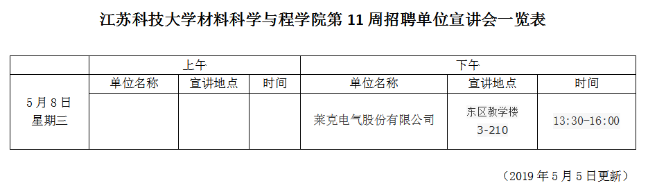招聘会|材料学院第11周招聘单位宣讲会一览表(2019年5月5日)