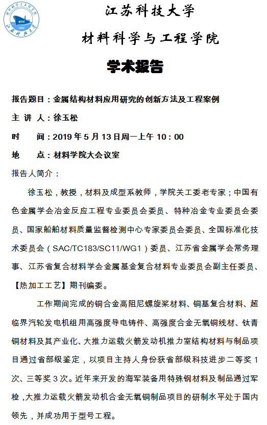 讲座预告|徐玉松:金属结构材料应用研究的创新方法及工程案例( 2019.05.13)
