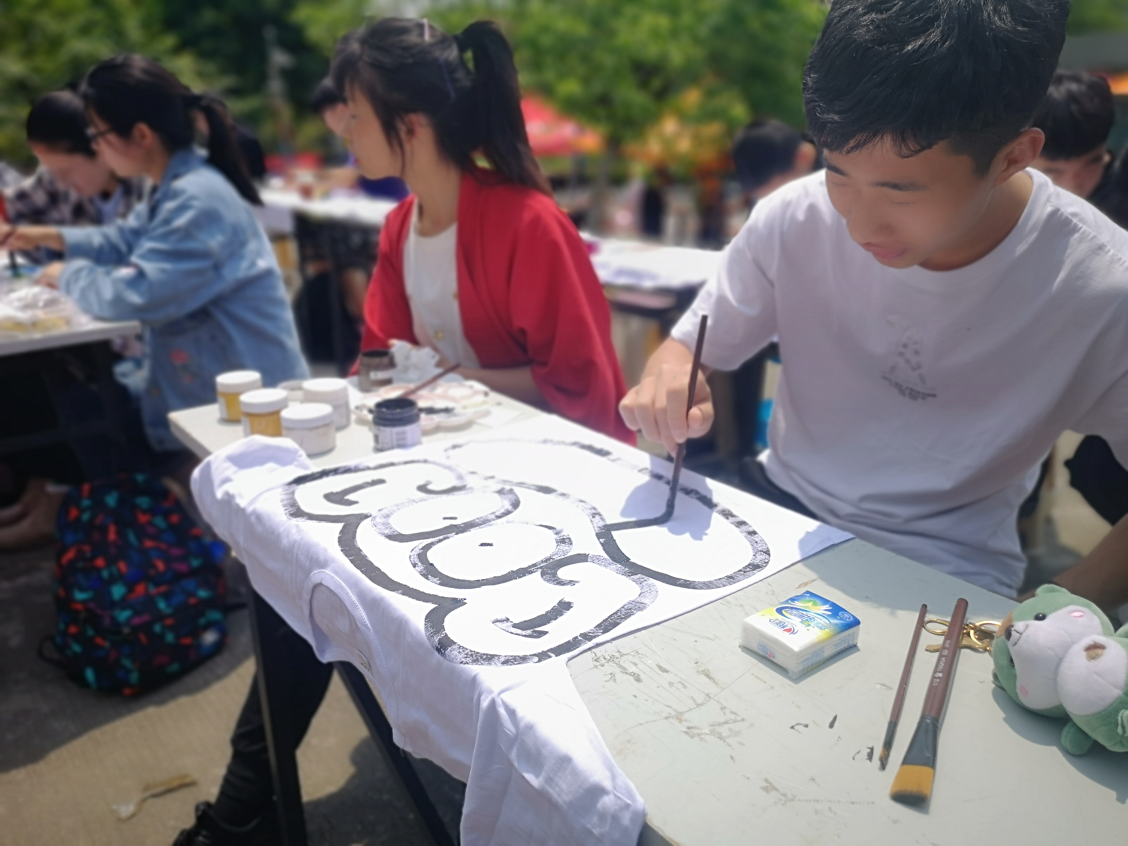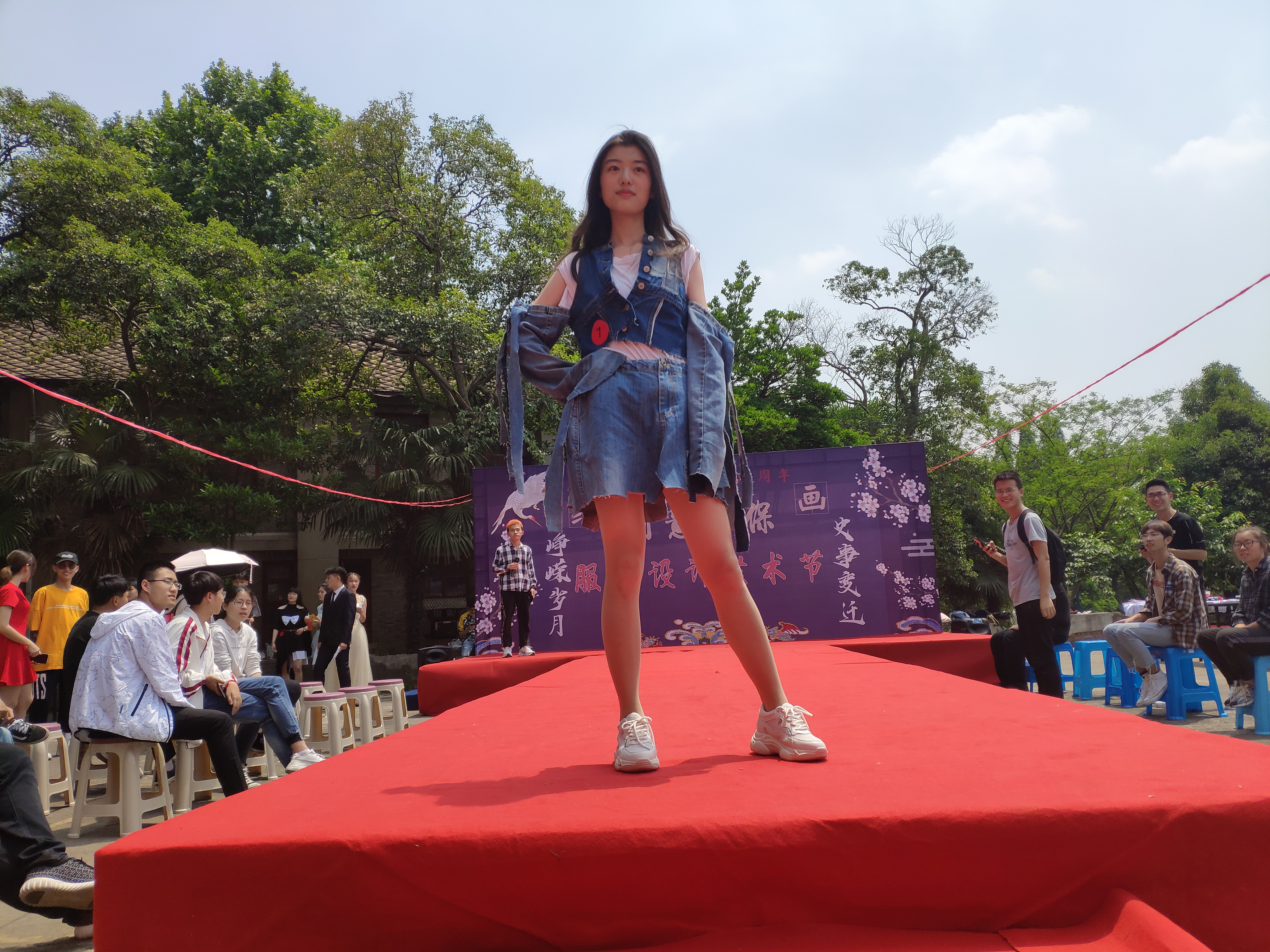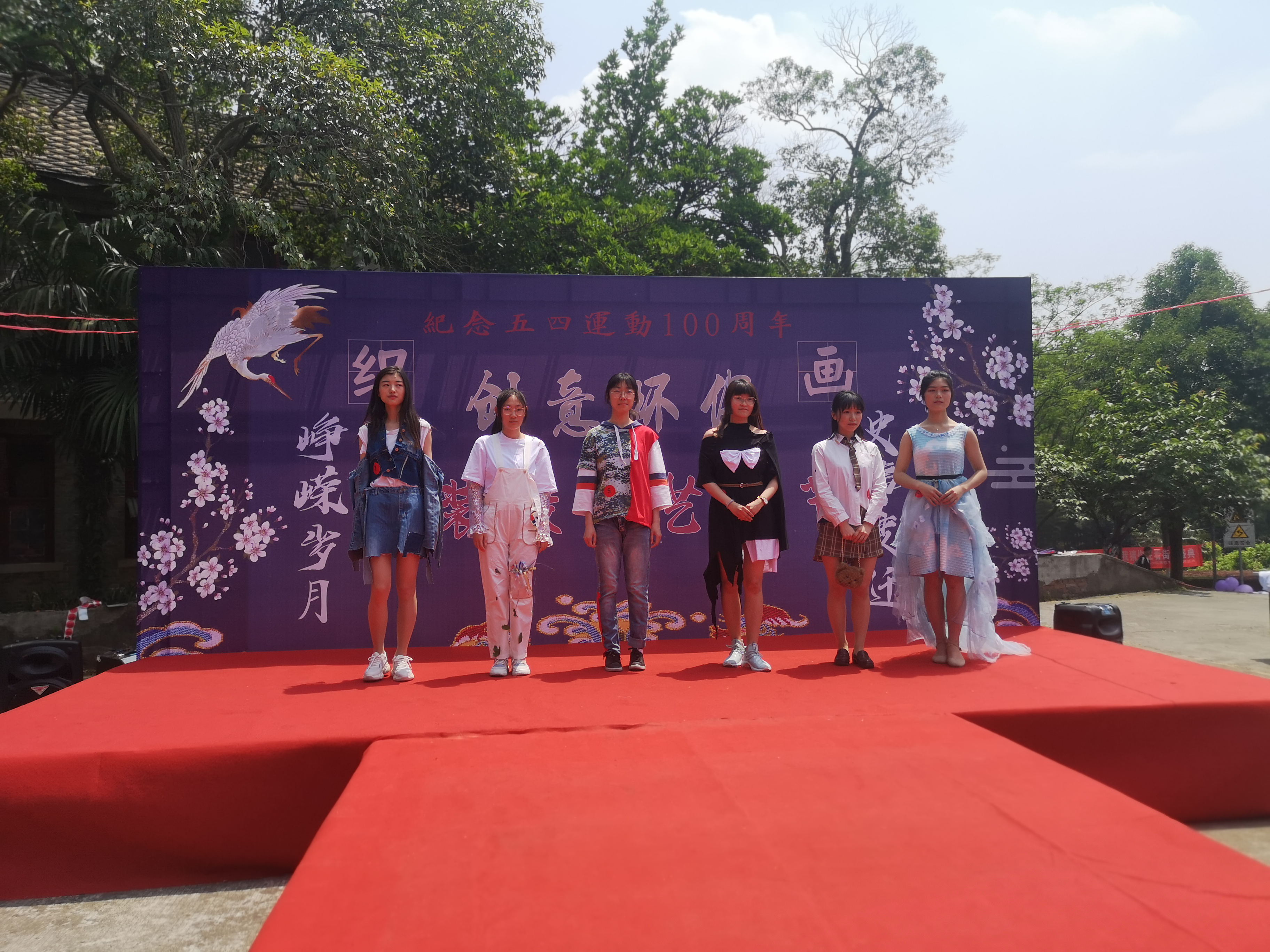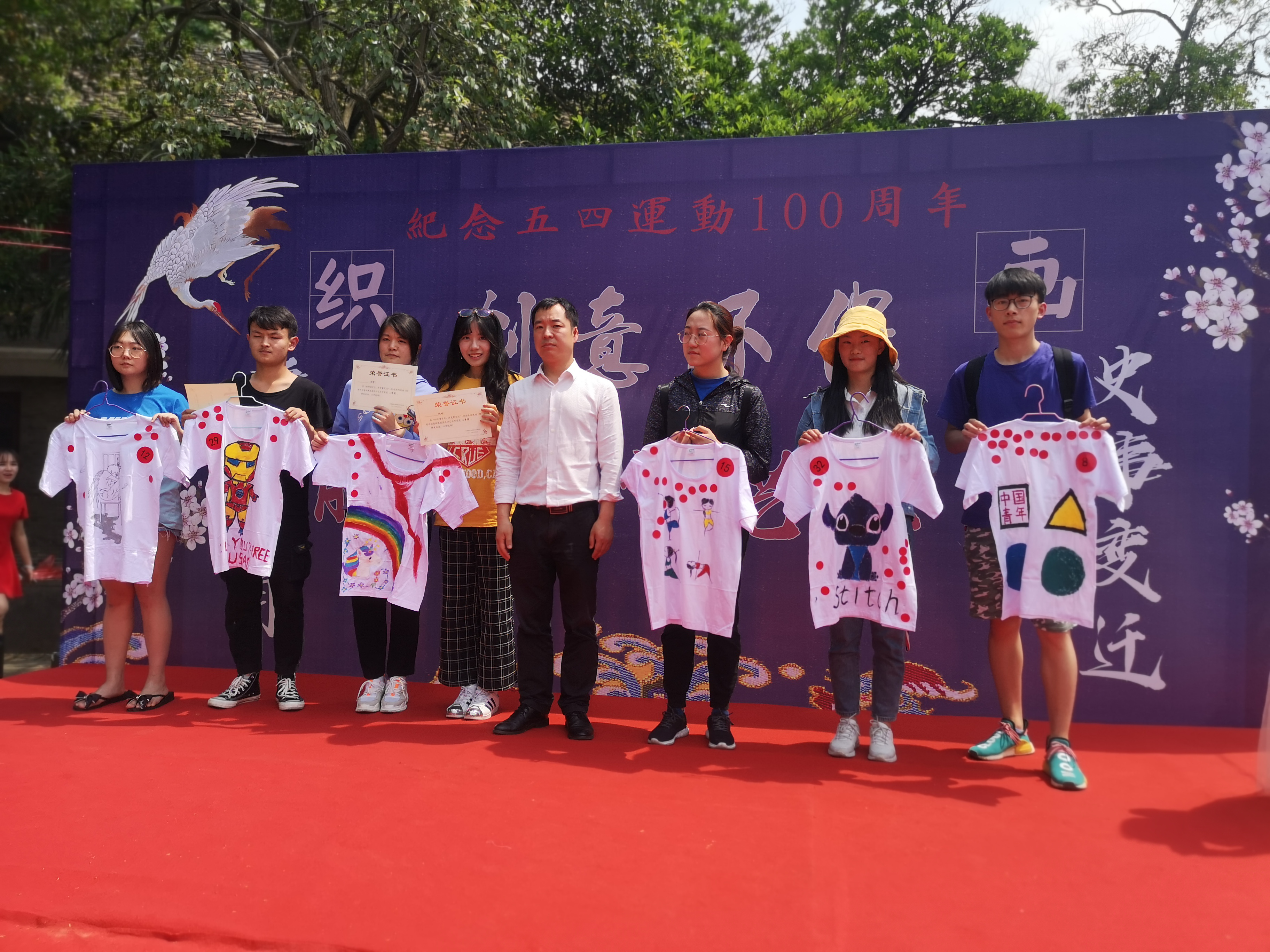 主持人宣布活动开始,六组模特分别身着参赛者已经设计好的服装上台展示并向大家介绍服装的创新点及含义,评委老师随后进行点评,观众对作品进行提问评价,最后通过打分评选出最有创意的服装设计。与此同时场边还有几十位同学在衣服上涂鸦进行创作,吸引了不少同学驻足观看,老师一边观看涂鸦过程并对参赛者给出一些小建议,帮助同学们完善自己的作品。创作结束后则由观众以投票的方式对涂鸦作品进行评比。评委老师对获奖作品颁发奖状并合影留念。