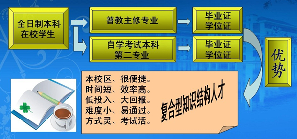 (2)节省学习时间。学生可以充分利用大学四年黄金学习时期,用业余时间完成第二个本科专业的学习。普教本科专业需学习40门以上课程,社会自考需修20门左右课程,而参加自学考试助学本科第二学历教育专业的学习可以免考许多课程,实际需要考试的课程一般只有10门左右,两年半时间内就可完成学习和考试,花时少,见效快,上一个大学可以获得两个本科毕业证书和两个学士学位(即6月底获得主修专业毕业证书,同期可获得自学考试本科文凭)。