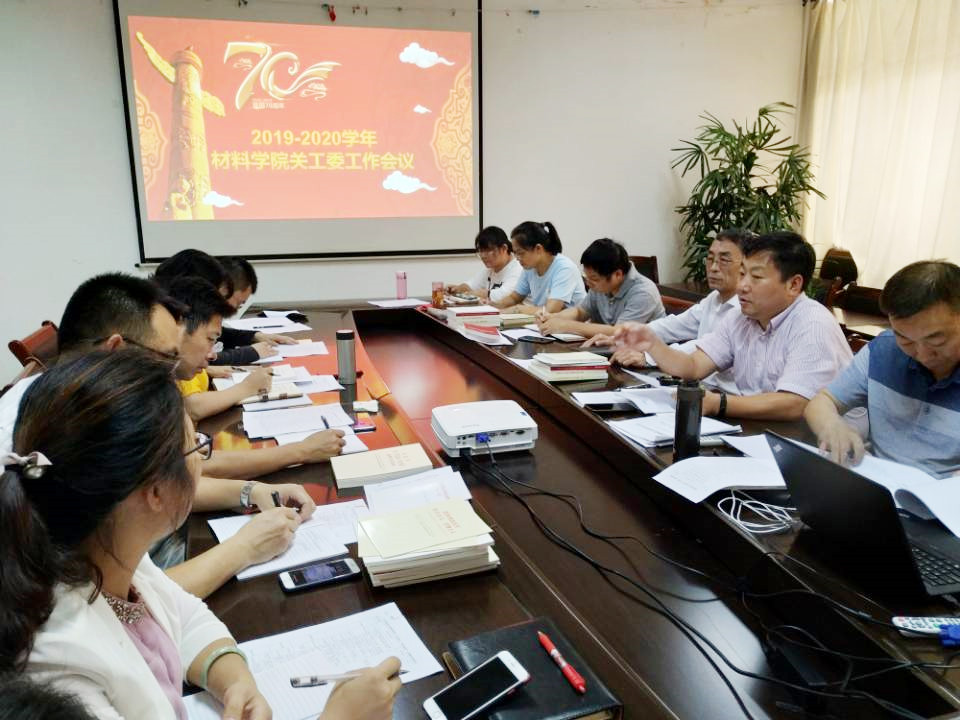 9月26日下午,材料学院关工委召开2019年下半年工作研讨会,就新学期推进关工委优质化建设工作进行专题学习讨论。参加会议的有学院党委书记、关工委主任祁凯,学院院长吴铭方、副院长金云学、黎文航,党委副书记、关工委副主任赵莉,学院团委书记、关工委秘书长李文达,以及各部门主任、新进教师等。会议由赵莉主持。