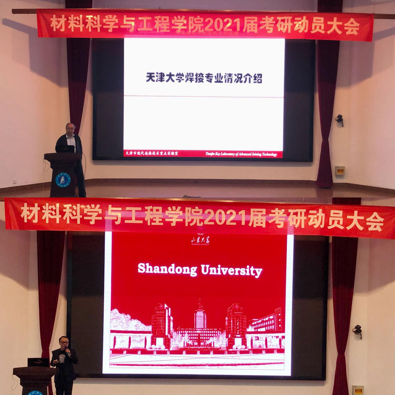 会上,天津大学的博士生导师李桓教授从天大焊接专业,主要的科研条件,以及各个研究团队的简介三个方面进行介绍,展示了天津大学的优良设备和科研实力,随后山东大学博士生导师闵光辉教授,介绍了山东大学和材料学院。两位教授诚挚的欢迎本校学生报考,并希望所有同学能够好好学习,拓展眼界,用知识丰富人生,将所学服务于社会。