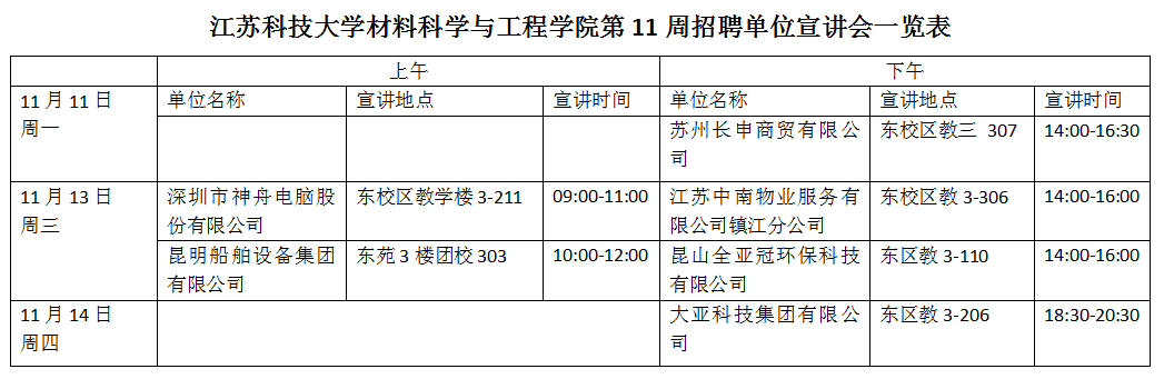 招聘会|材料学院下半年第11周招聘单位宣讲会一览表(2019年11月11日)