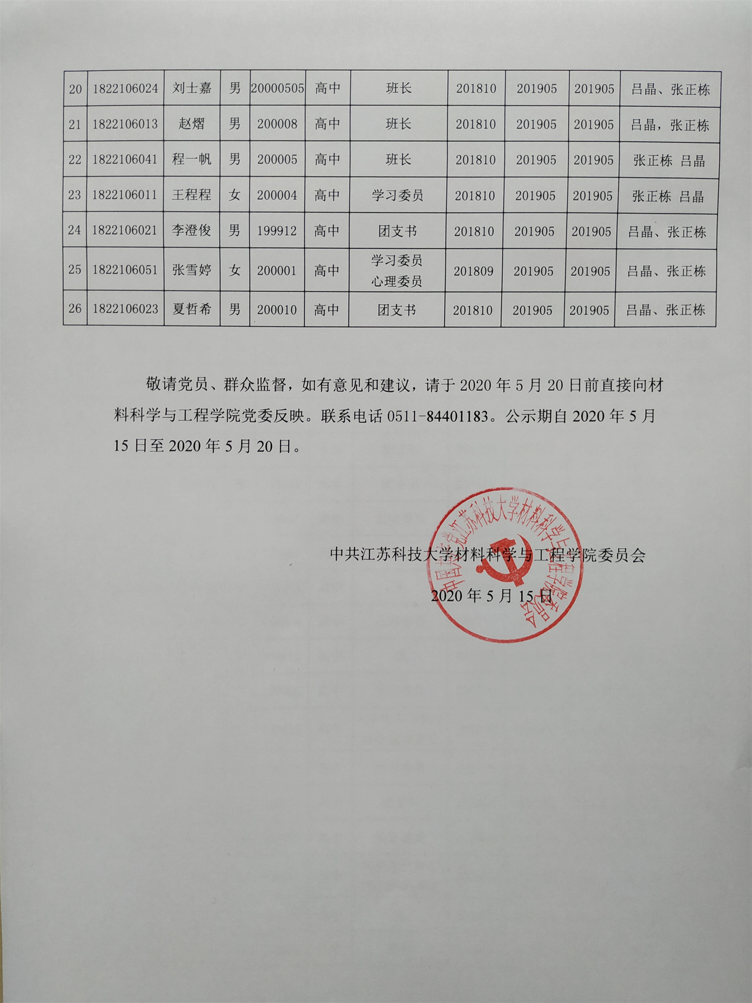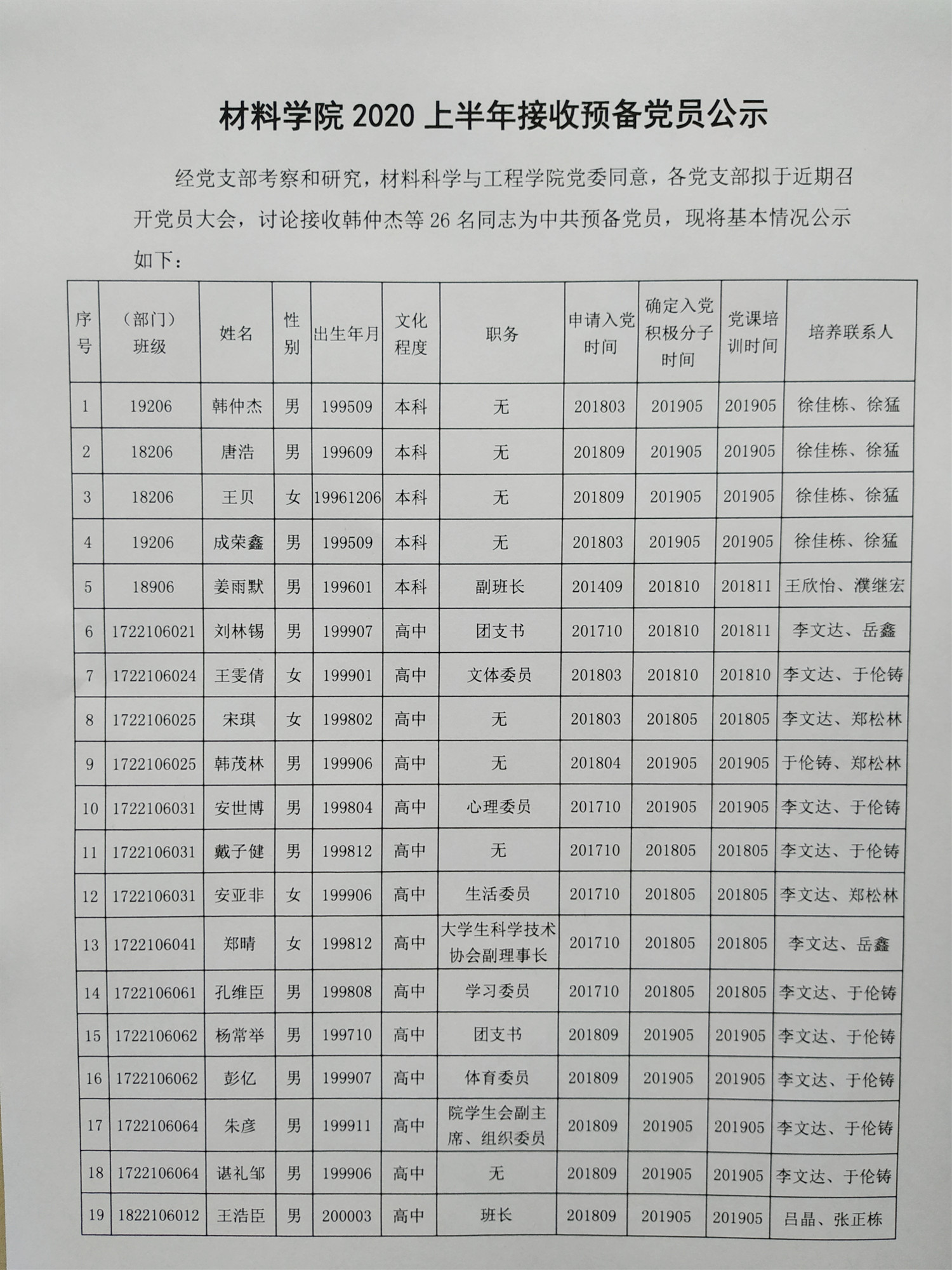 公示|材料学院2020年上半年接收预备党员公示