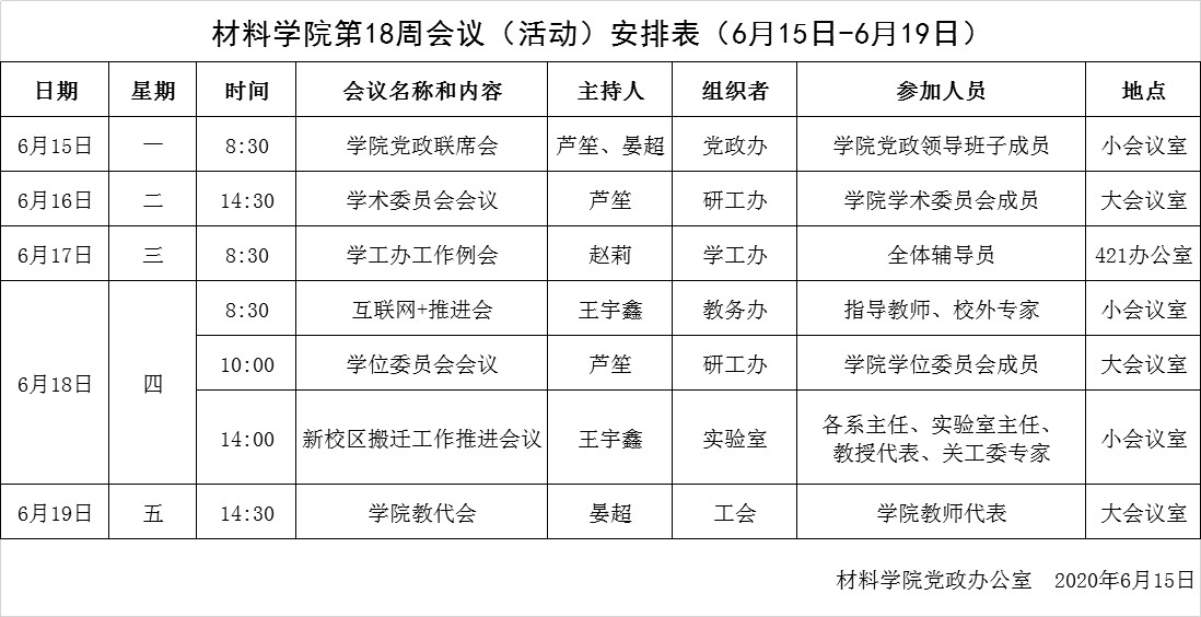 材料学院第18周会议(活动)安排表(6月15日-6月19日)