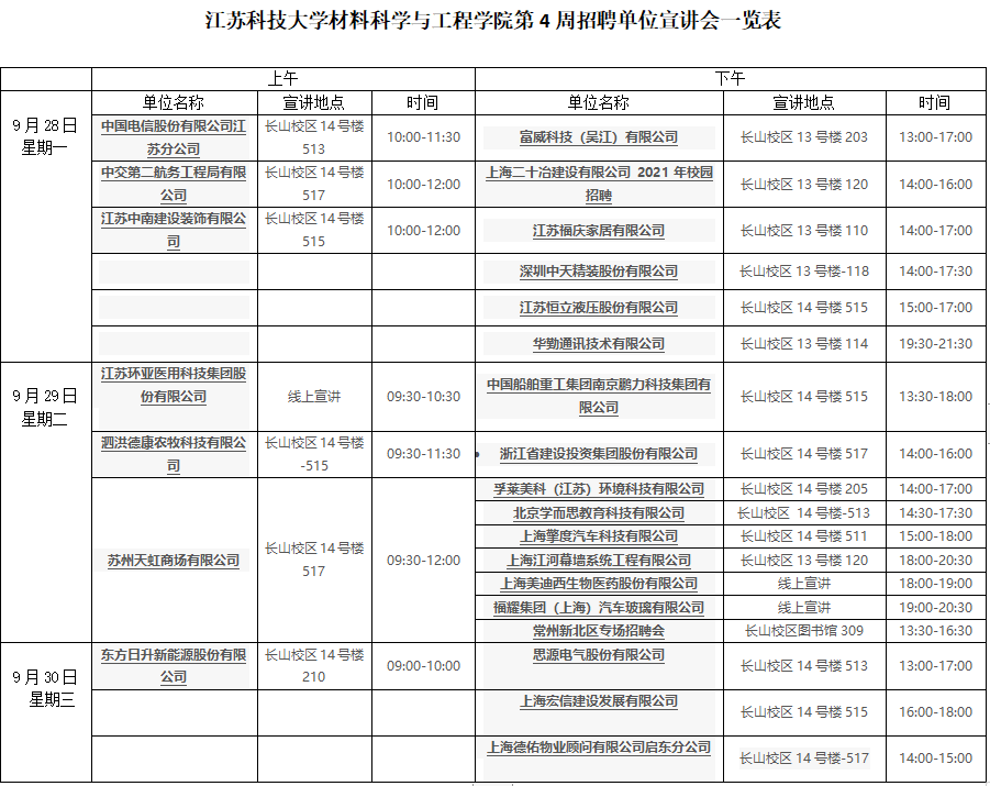 江苏科技大学材料科学与工程学院第4周招聘单位宣讲会一览表(2020年9月28-30日)