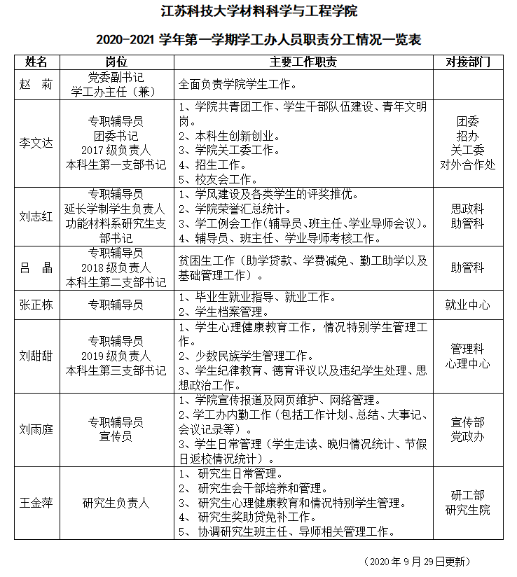 材料学院2020-2021学年第一学期学工办人员职责分工情况一览表