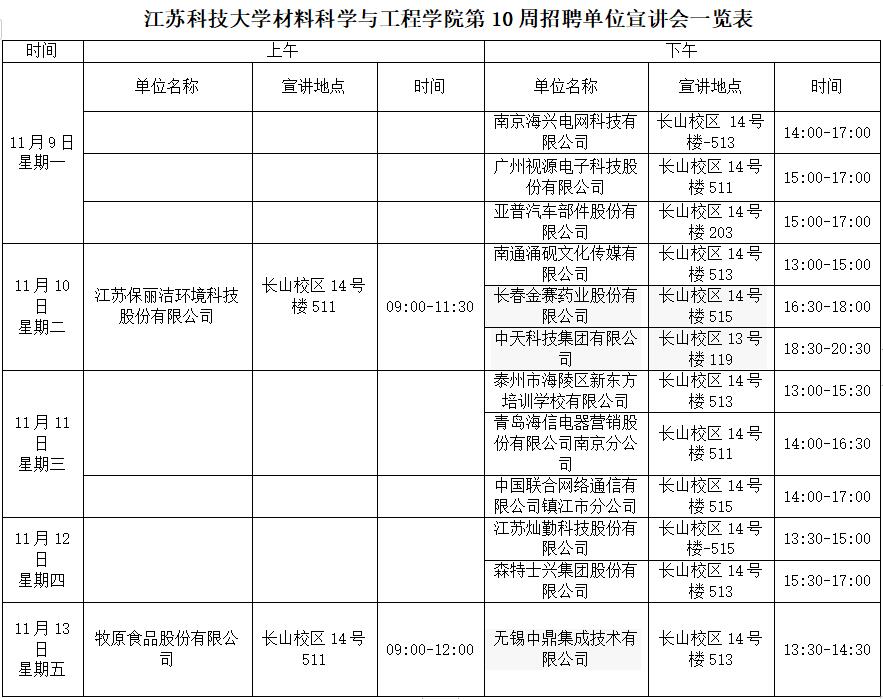 江苏科技大学材料科学与工程学院第10周招聘单位宣讲会一览表(2020年11月9-13日)