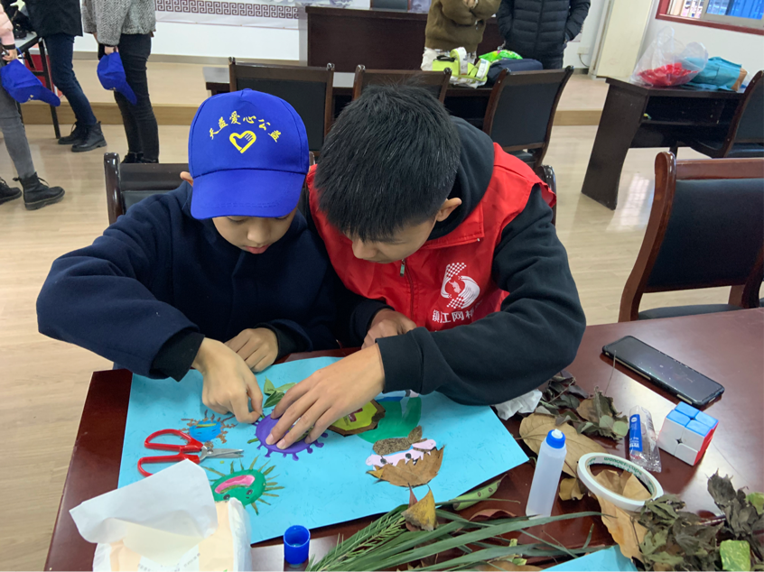 活动过程中,七名志愿者与小朋友们一起合作用落叶进行贴画。志愿者打开准备好的画作,指导小朋友通过比对图形,找出形状相似的落叶,并将其剪裁后用胶水贴上,与画作融为一体。贴画期间,小朋友们发挥了天马行空的想象力,在画作上添加了许多新的元素。有的小朋友拼出了白衣天使的样子,有的小朋友写下了“加油”,还有的画上了自己认知中的病毒。他们的创意与原画完美贴合,融进画里的不仅是小朋友们的创意,更是他们对抗疫英雄的敬仰以及对抗疫行动的深刻感受。对病毒举起的矛与盾代表的是对新冠的抗击,火神山雷神山是对中国速度的深刻见证……