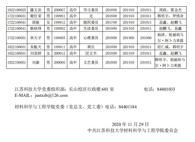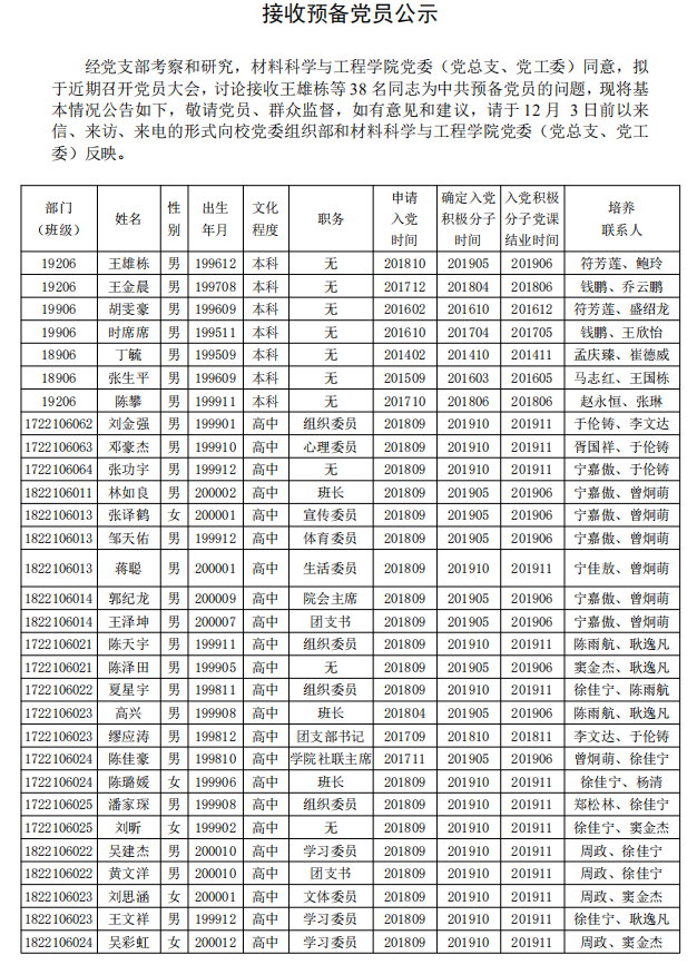 材料学院2020年下半年接收预备党员公示