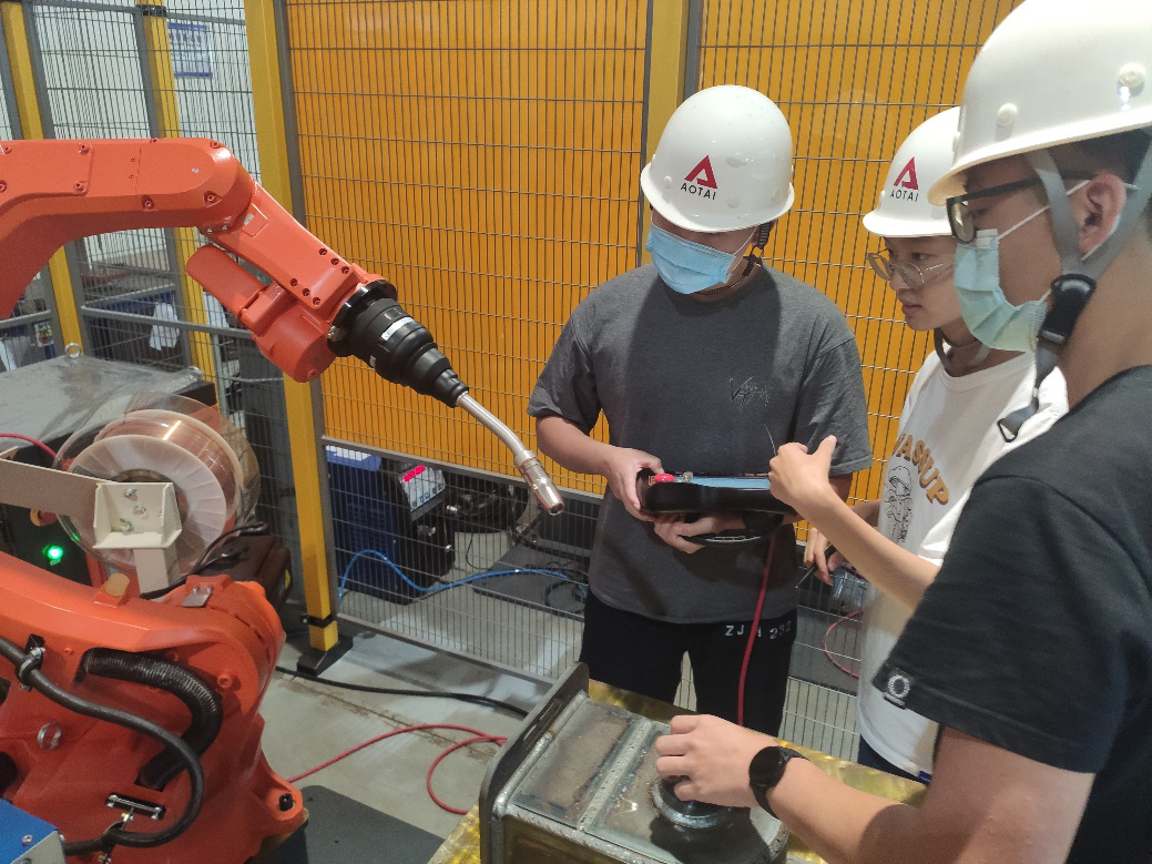 机器人焊接人才需求旺盛,我校以竞赛为抓手,检验机器人焊接人才培养成效。江苏科技大学材料学院副院长陈书锦教授、朱杰老师带领焊接专业四名本科生组建队伍,与企业、高校代表队同台竞技。自今年8月起,选手在比赛培训班中学习焊接机器人示教、编程、焊接工艺等方面的实践技能,开展“科技强国”暑期社会实践活动,全力准备全国焊接机器人大赛。团队放弃假期、真干实练,从问题中提高理论认识和实践能力,将焊接方法、焊接结构、焊接材料的知识真正用于机器人焊接结构的复杂工程问题。
