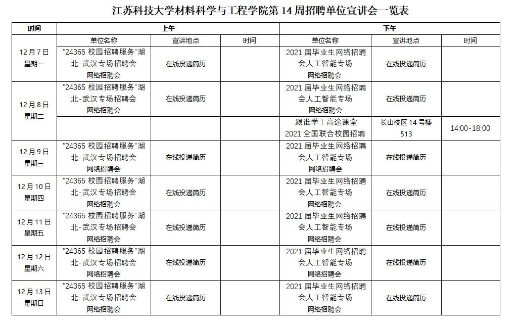 江苏科技大学材料科学与工程学院第14周招聘单位宣讲会一览表(2020年12月7-13日)