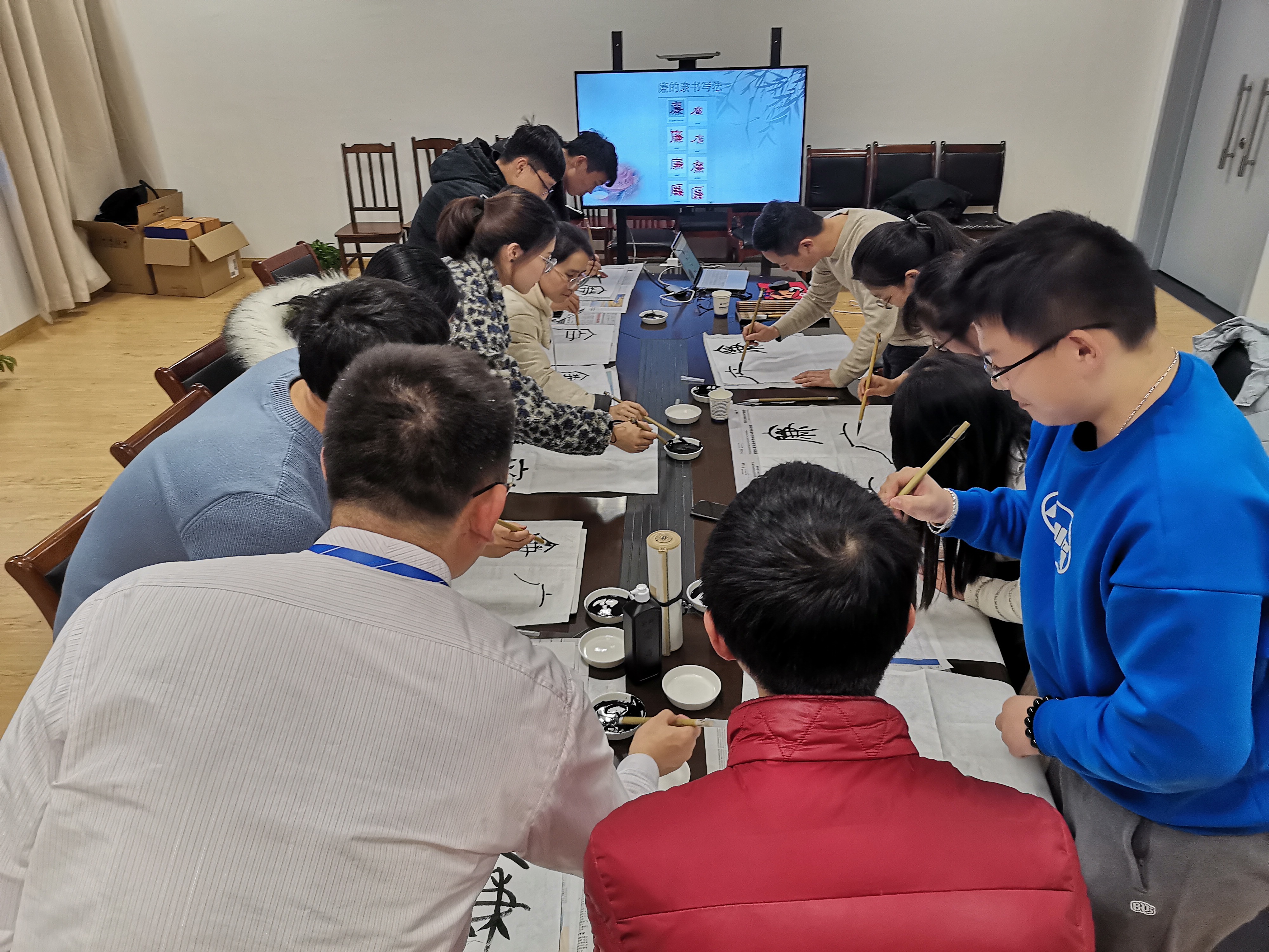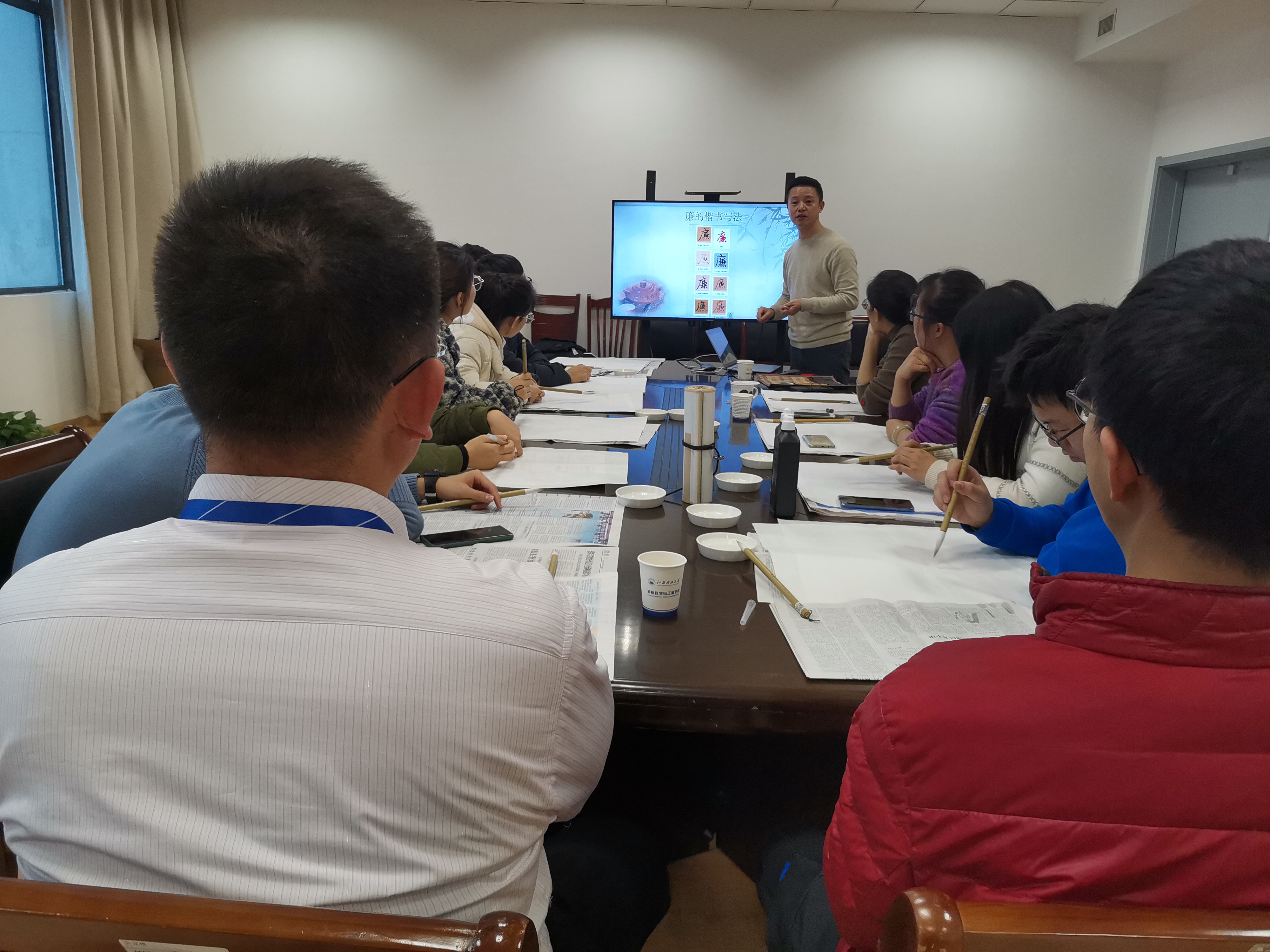 在谈及书法特点时,张老师结合米芾临本《兰亭序》讲述了米南宫与镇江的渊源。随后,张老师提到艺术与为人处世有相通之处,书法和舞蹈亦是如此。在一众疑惑的目光注视下,张老师播放了一段“永字八法”的独舞。该舞以肢体语言展现书法的起承转合,笔画与动作两相契合,一一对应,不禁让人拍案叫绝。最后,张杰老师介绍了如何启封毛笔,并带领大家临摹“廉”字的五种写法。笔落之际,张老师认真指导每一位参会者,从字形结构和笔法变化等专业角度,对各个作品进行了点评。