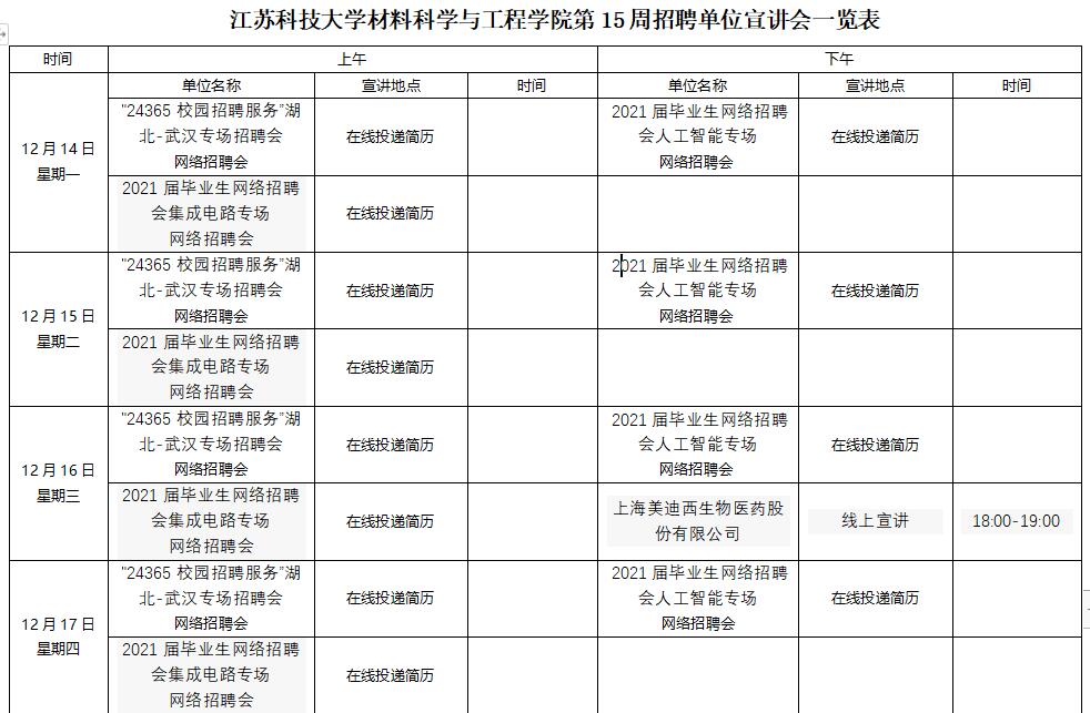 江苏科技大学材料科学与工程学院第15周招聘单位宣讲会一览表(2020年12月14-20日)