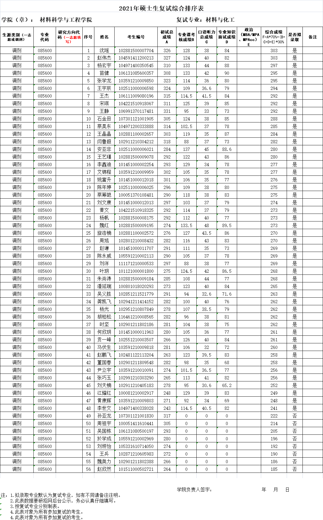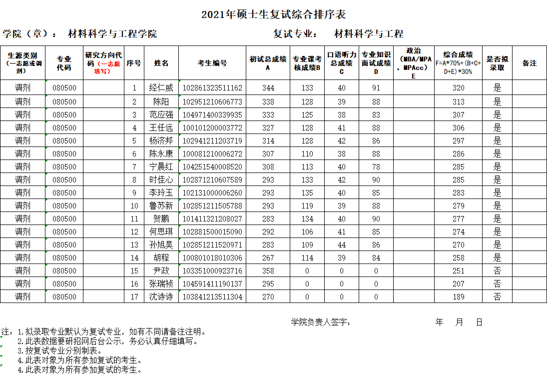 考研公示|材料学院2021年硕士生(第一批)调剂复试成绩排序表