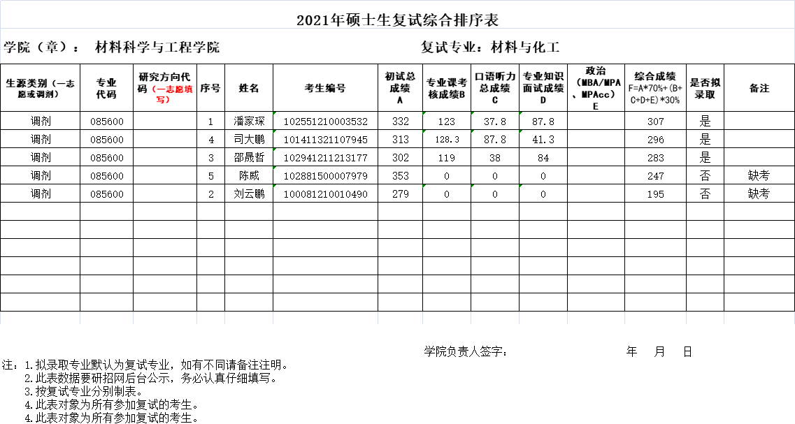 考研公示|材料学院2021年硕士生(第五批)调剂复试成绩排序表