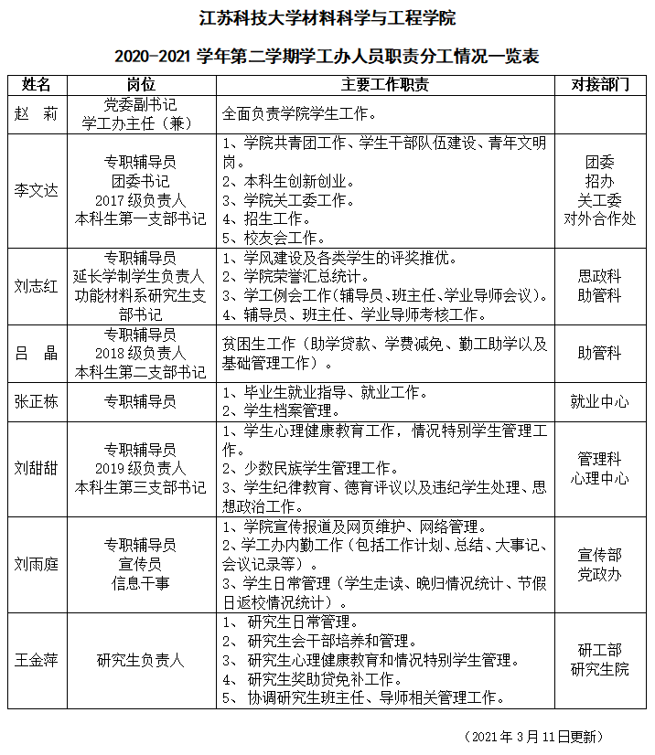 材料学院2020-2021学年第二学期学工办人员职责分工情况一览表
