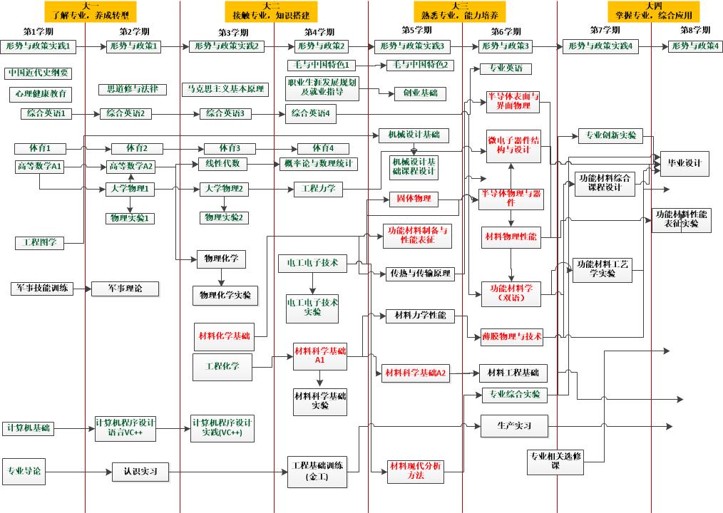 主要实践性教学环节:物理实验、电工电子技术实验、机械设计基础课程设计、材料科学基础实验、物理化学实验、专业创新实验、专业综合实验、材料物理性能实验、功能材料性能表征实验、功能材料工艺学实验、专业实习、毕业设计等。