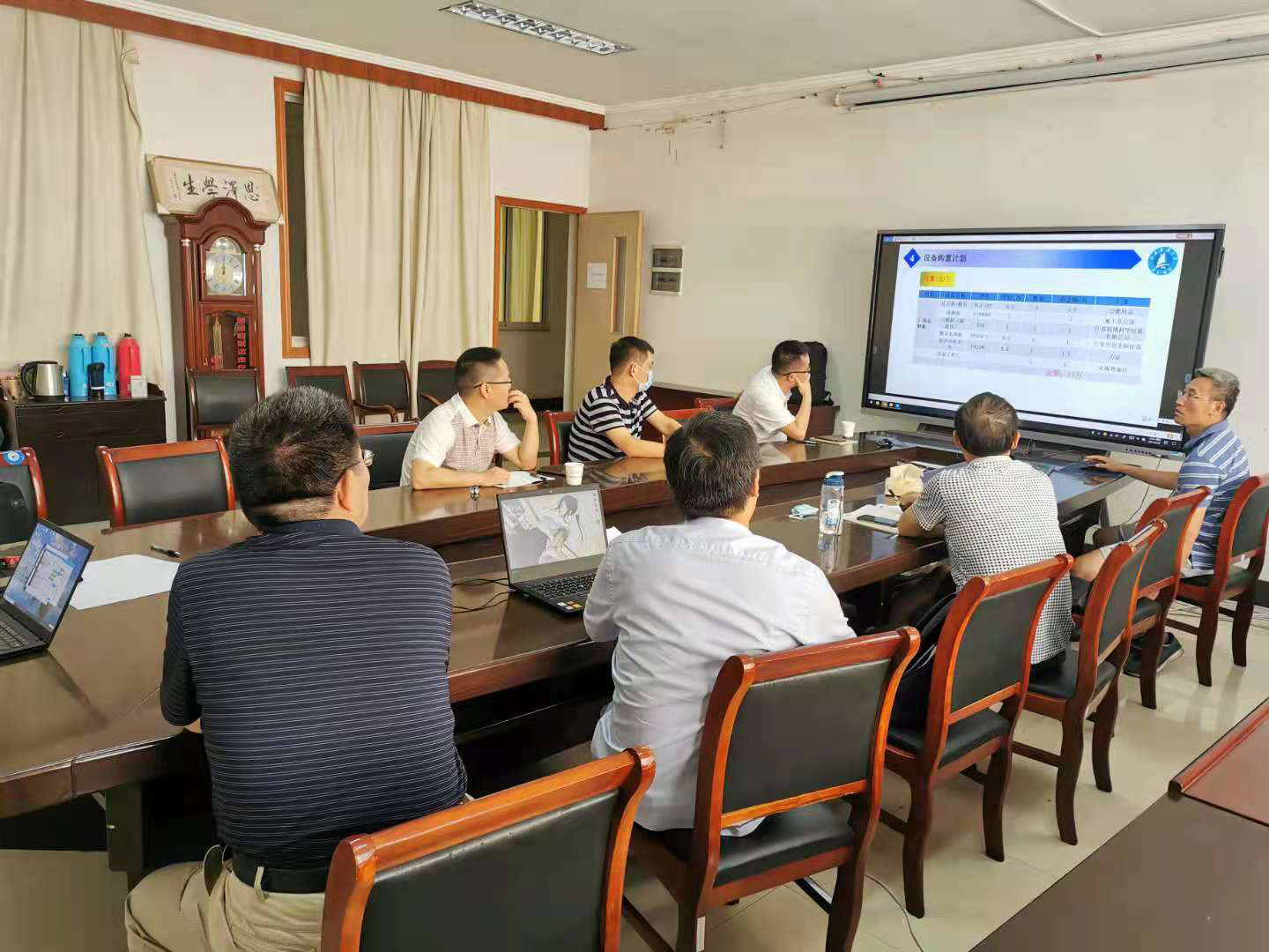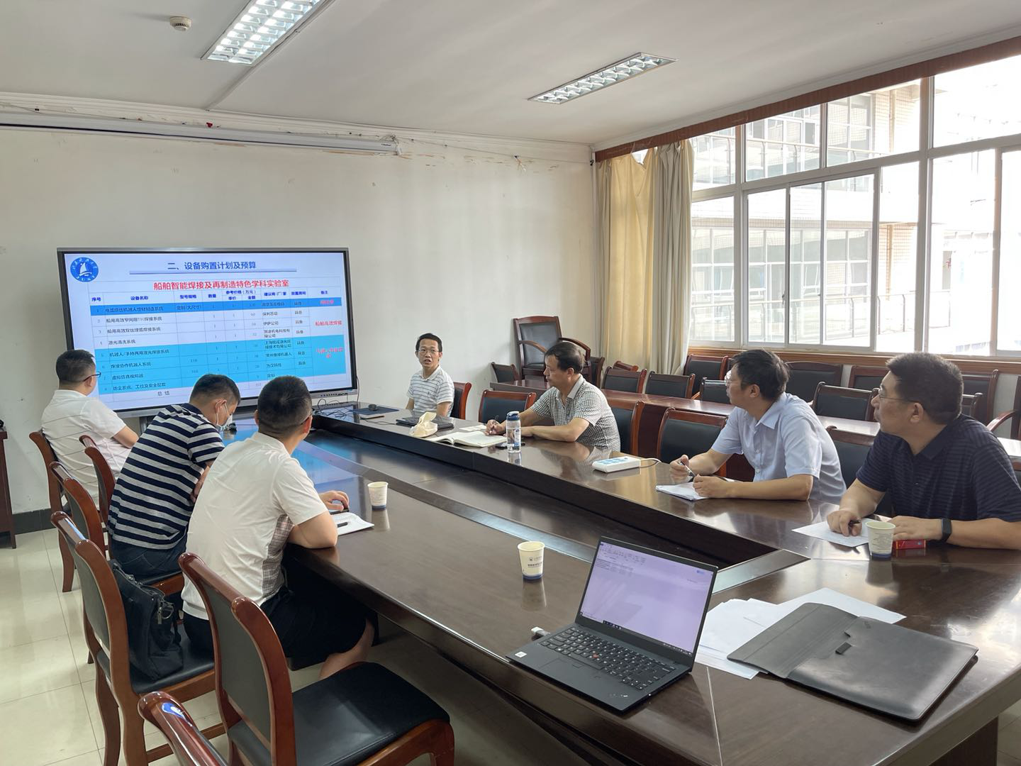 焊接系主任胥国祥做了“船舶智能焊接及再制造特色学科实验室”设备购置计划和申购论证的汇报,他围绕学校船舶特色、从船舶机器人智能焊接、船舶高校焊接工艺及装备和船舶高效再制造三个方面提出了设备的设置需求、计划及预算及设备功能,并进行了相关设备的调研与论证。