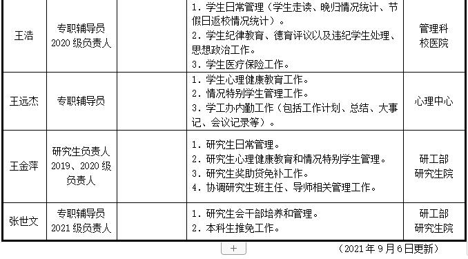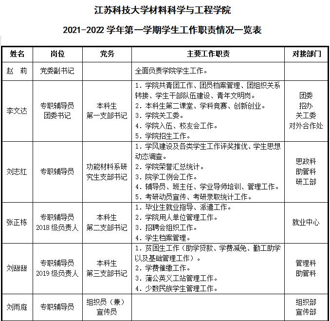 材料学院2021-2022学年第一学期学生工作职责情况一览表