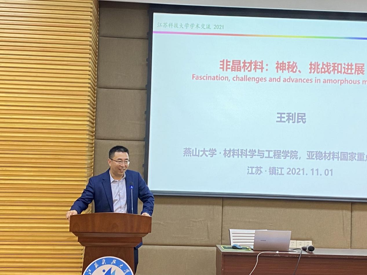 在长山校区图书馆B101报告厅,王利民院长为材料学院师生做了题为“非晶材料:神秘、挑战与发展”的学术报告。王院长生动形象的介绍了燕山大学所在地秦皇岛市和镇江市两地相似的历史文化元素,展示了燕山大学材料学院的发展历程、师资队伍、专业设置、平台建设、科研创新等方面的内容。其次,他深入浅出地介绍了非晶材料的研究现状、课题组在非晶材料领域开展的工作及取得的成果以及非晶材料在药物、半导体等领域的应用前景,并与现场师生进行了互动交流。