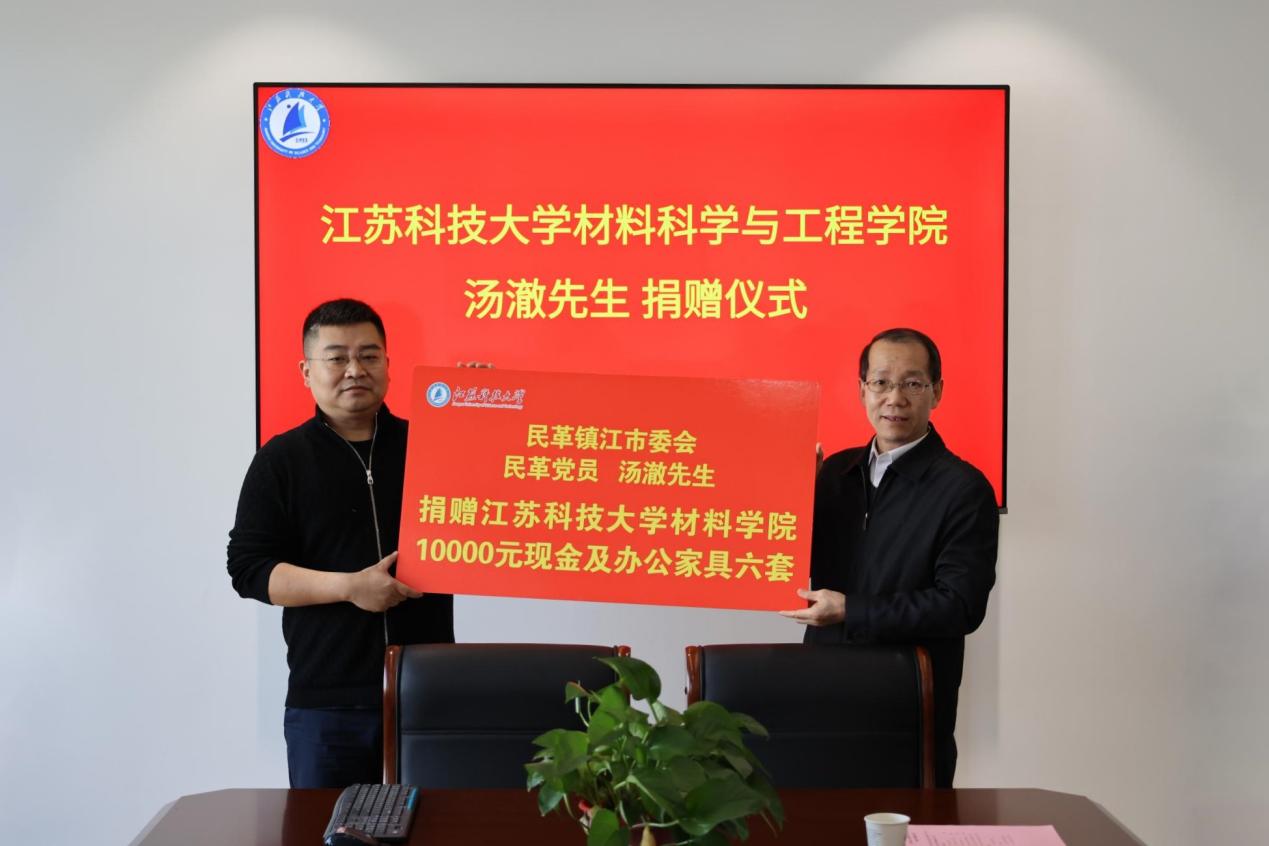 汤澈先生现为江苏省侨联青年委员会委员,民革党员,镇江力航新材料科技有限公司执行董事,镇江蓝宝石电子实业有限公司董事。他向校团委捐赠桂花树两颗,本次向材料学院捐赠办公家具6套和1万元学生活动费表示,非常感谢江苏科技大学对自己的支持,今年是中国共产党建党100周年,辛亥革命110周年,作为一名民革党员,始终坚持中国共产党的领导,秉承中山博爱精神,为中国新材料事业添砖加瓦。