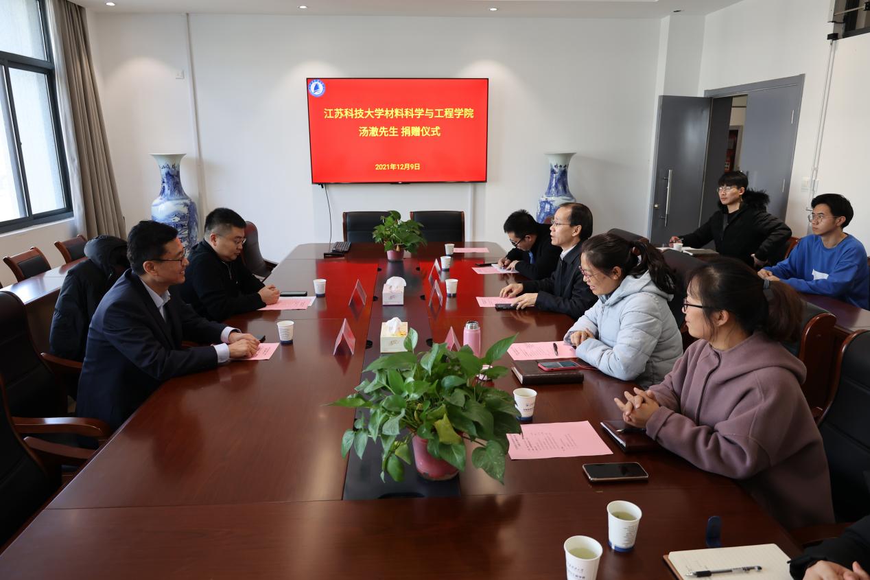 12月9日,材料学院于材料楼512会议室举行汤澈先生捐赠仪式。副校长、民革镇江市委主委王加友出席捐赠仪式,镇江市民革专职副主委兼秘书长方玉强材料学院院党委副书记赵莉、副院长王宇鑫,及师生代表参加活动。捐赠仪式由院党委副书记赵莉主持。
