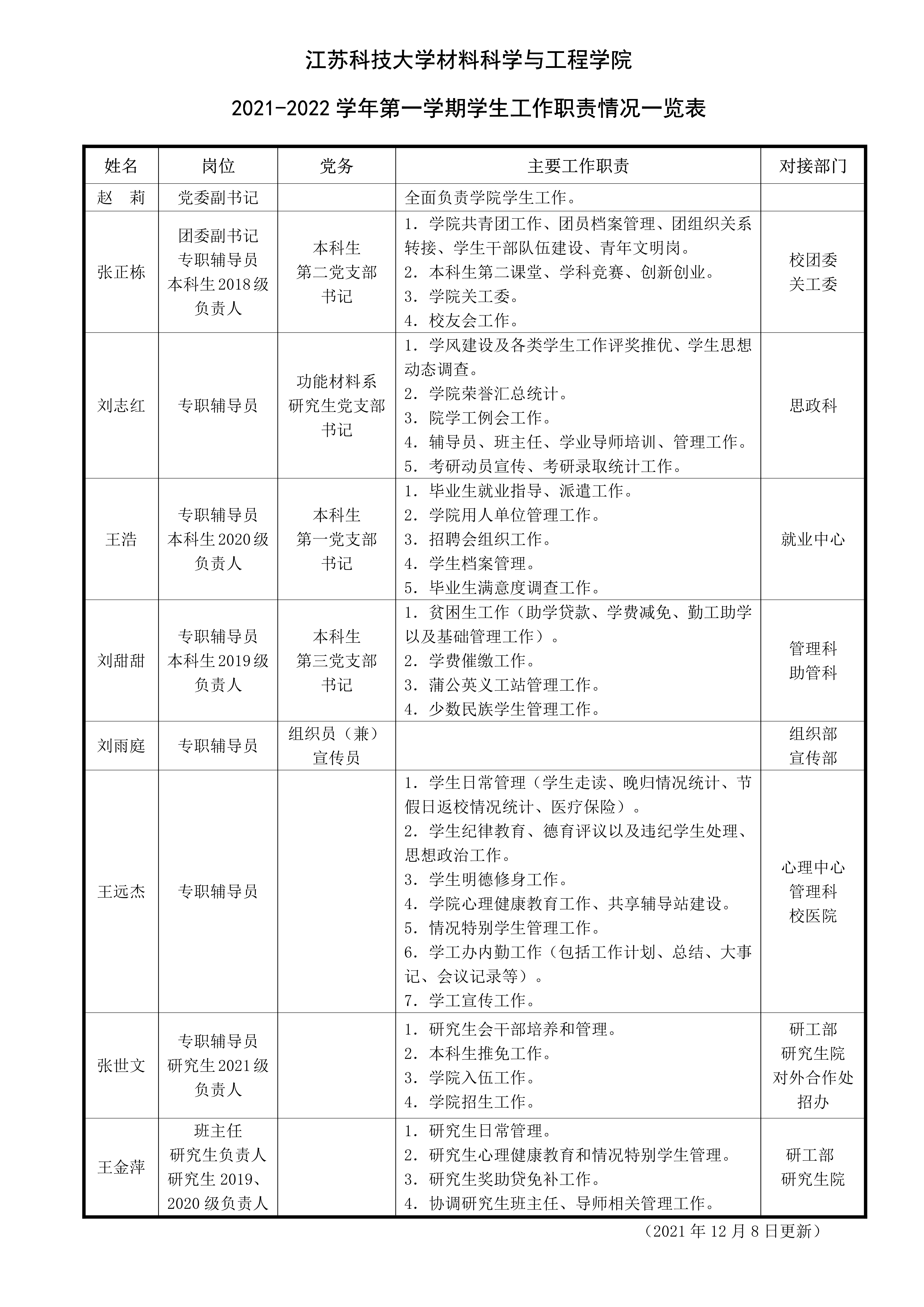 材料学院 2021-2022学年第一学期学生工作职责情况一览表