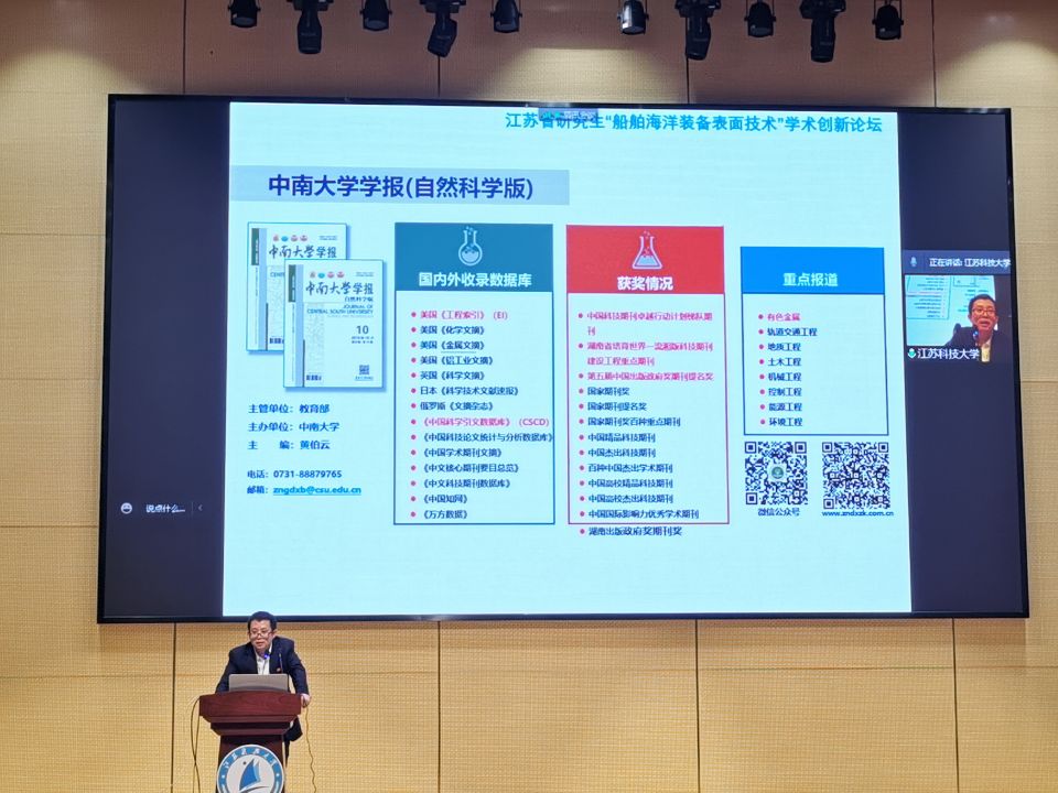 江苏大学机械工程学院院长鲁金忠教授、中南大学出版社副社长彭超群教授、河海大学李保松教授、江苏科技大学李瑞峰教授、王宇鑫教授,中国工程物理研究院姚彩珍研究员、水利部机械设计研究院陈小明高级工程师、中山大学伍廉奎副教授、中北大学张利副教授、湖南大学张卫东副教授等国内知名专家学者依次作大会邀请报告,内容涉及船舶海洋装备材料及先进表面技术等前沿研究领域,获得与会代表们的热烈反响。