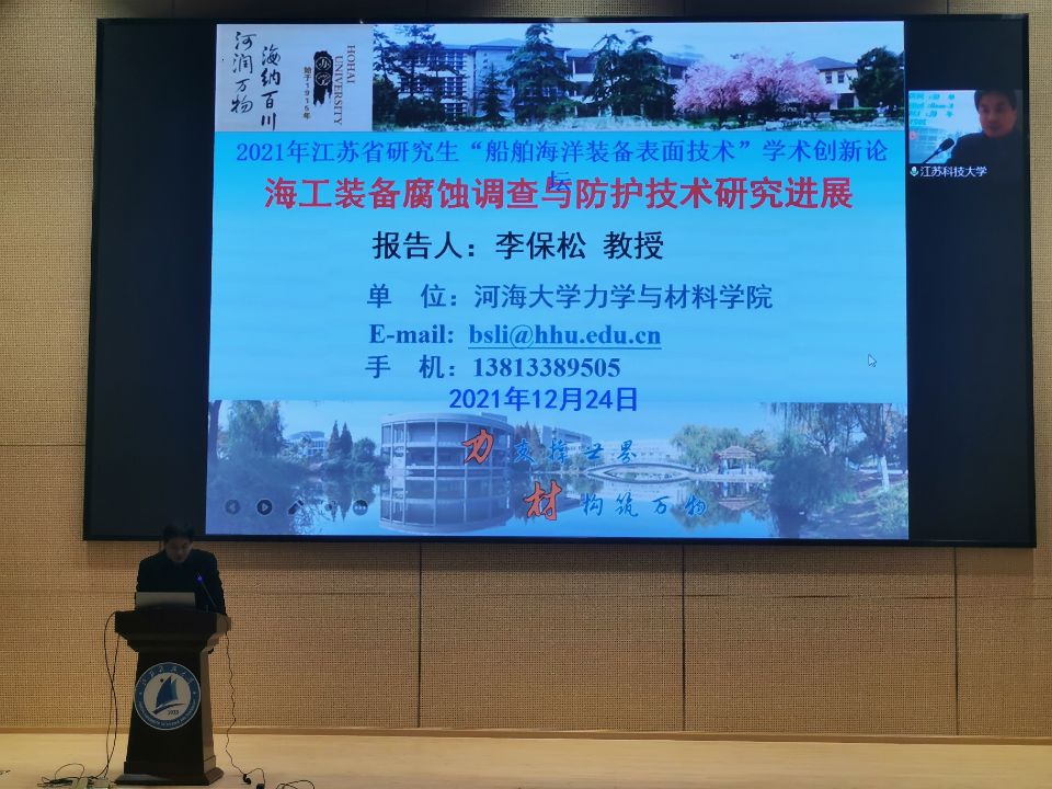 12月23日至25日,由江苏省工学3类研究生教育指导委员会主办,江苏科技大学承办的2021年江苏省研究生“船舶海洋装备表面技术”学术创新论坛在我校成功召开。校党委副书记许俊华教授和江苏省研究生教指委委员江苏科技大学教授徐玉松出席论坛并致辞。开幕式由江苏科技大学材料科学与工程学院院长芦笙教授主持。