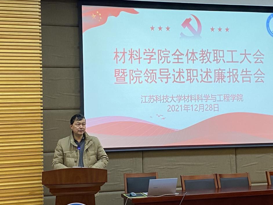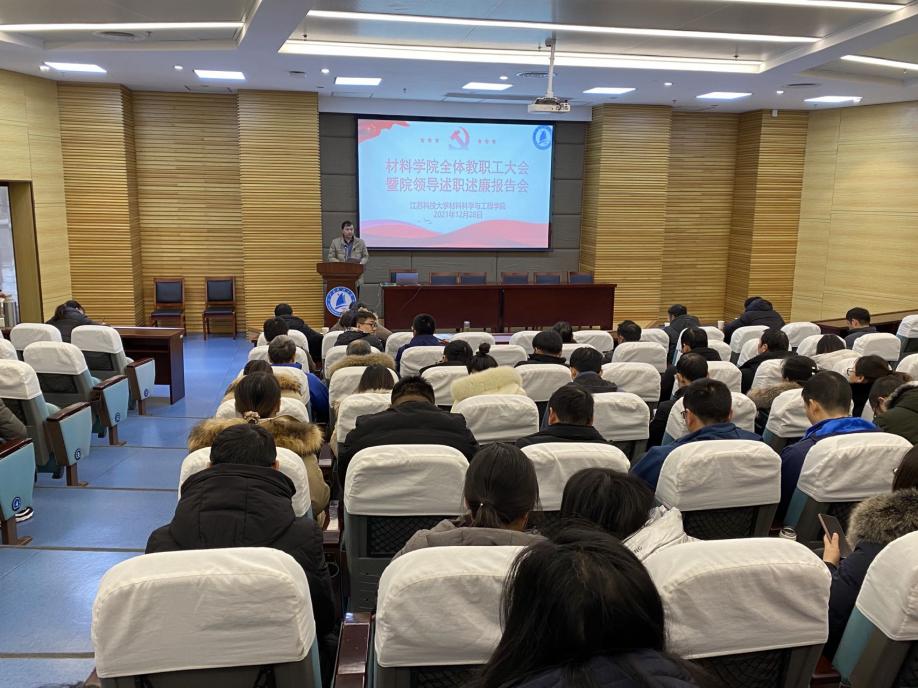 12月28日上午,材料学院在图书馆B101报告厅举行2021年度领导班子成员述职述廉报告会。学院党委书记晏超主持会议,学院全体教职工参加会议。