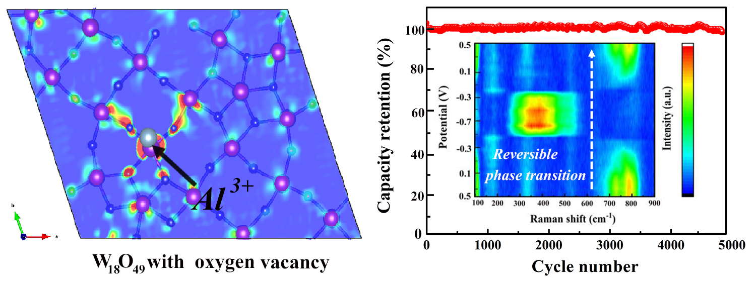 该研究工作成功地设计了一种富氧缺陷的新型钨基阳极材料用于水系铝离子电池。电化学测试和DFT计算证实了氧空位对于提升钨基水系Al3+存储的重要作用。利用原位Raman等表征技术,动态探究了充放电过程阳极材料的结构演变规律,揭示了氧化还原储能机制。通过匹配CuFe-PBA有机物为阴极材料,构建了一种高性能软包水系铝离子电池,该电池不仅具有高安全性和低成本,同时展现出优越的能量/功率密度和5000次循环后接近95%的超高保持率。