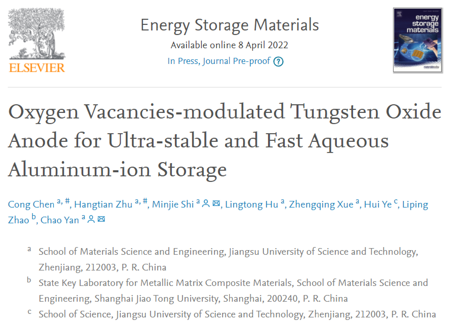 近日,我校材料科学与工程学院晏超教授团队在能源材料研究领域取得突破,以江苏科技大学为第一单位以及唯一通讯单位在能源材料领域顶级期刊《Energy Storage Materials》(影响因子为17.789,材料科学一区,TOP期刊)上发表高水平研究论文。该论文题目为“Oxygen Vacancies-modulated Tungsten Oxide Anode for Ultra-stable and Fast Aqueous Aluminum-ion Storage”,研究生陈聪为第一作者,晏超教授和施敏杰副教授为该论文的共同通讯作者。