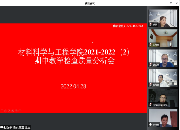 4月28日下午2点,材料学院召开了2021-2022(2)学期线上教学情况与质量分析会。学院领导班子成员、各系主任及部分教师代表共三十余名教师参加了会议。校督导组专家潘宝俊出席会议,会议由教学副院长陈书锦主持。