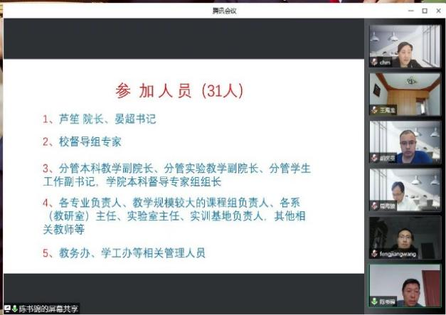 晏超书记首先介绍了近期学校疫情环境下的政策和方案,他肯定了当前环境下学院老师适应疫情环境下的线上教学工作成绩,鼓励大家进一步提高线上教学质量积极探索新的教学方法和手段。