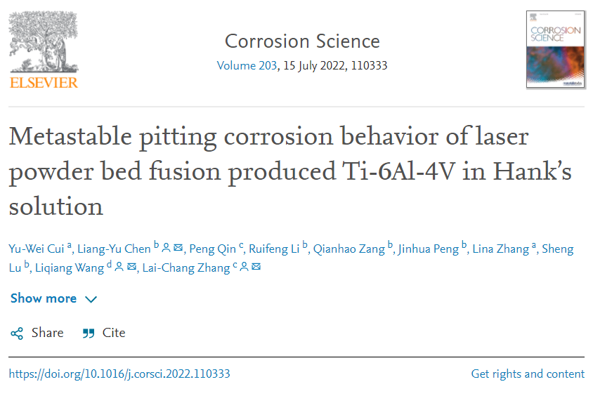 近日,我院陈靓瑜副教授在腐蚀领域顶刊《Corrosion Science》(影响因子为7.205,材料科学一区,TOP期刊)上发表高水平研究论文。该论文题目为“Metastable pitting corrosion behavior of laser powder bed fusion produced Ti-6Al-4V in Hank’s solution”,研究生崔雨薇为第一作者,陈靓瑜副教授为通讯作者。