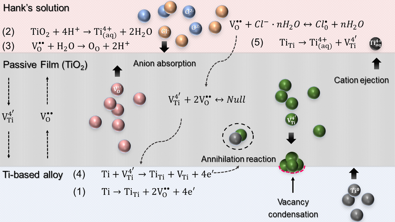 激光粉床熔融(Laser powder bed fusion,LPBF)技术制备的合金因为材料利用率高、生产周期短、不受目标零件几何形状约束等优点被广泛应用于合金的加工制备。然而,激光粉床熔融制备的钛合金因为其特殊的加工工艺,出现了传统制备时没有发现过的现象——点蚀。该论文首先对比了激光粉床熔融Ti-6Al-4V和退火态Ti-6Al-4V之间的亚稳态点蚀差异,确定了激光粉床熔融Ti-6Al-4V更容易出现点蚀,并且根据点缺陷模型尝试建立亚稳态点蚀机制。采用电化学方法来研究激光粉床熔融Ti-6Al-4V在汉克斯溶液中的亚稳态点蚀行为,计算得到在激光粉床熔融Ti-6Al-4V表面形成的钝化膜有更高的氧空位通量,并且吸附更多的侵蚀性离子,从而导致大量的阳离子空位。在腐蚀过程中生成的阳离子空位会扩散到金属/膜界面,并被阳离子湮灭,如果没有及时消除,过量的阳离子空位就会凝结生成孔的形核从而增加亚稳态点蚀发生的概率。