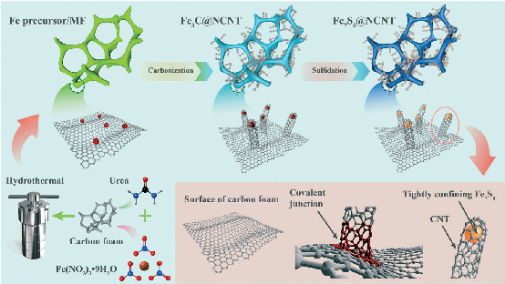 近日,我校材料科学与工程学院李照磊课题组与中国科学院固体物理研究所周宏建课题组合作,利用三聚氰胺泡沫框架,制备了氮掺杂碳纳米管封装的 Fe7S8纳米颗粒 (Fe7S8@NCNT),并运用电容去离子(CDI)技术,实现了对水中Pb2+的选择性吸附。该研究成果以“Nitrogen-doped carbon nanotube encapsulated Fe7S8 nanoparticles for high-efficiency and selective removal of Pb2+ by pseudocapacitive coupling”为题于2022年4月发表在生态环境材料领域国际权威期刊《Environmental Science: Nano》(即时影响因子为9.1,中国科学院一区,TOP期刊)上。此外,双方还合作开发出了氮硫共掺杂的FeS2碳复合材料(FeS2@NSC),运用CDI技术实现了对废水中Cu2+离子的吸附。该研究成果以“Highly selective capacitive deionization of copper ions in FeS2@N, S co-doped carbon electrode from wastewater”为题,于2021年1月在工程技术领域国际权威期刊《Separation and Purification Technology》(即时影响因子8.9,中国科学院一区,TOP期刊)上发表。