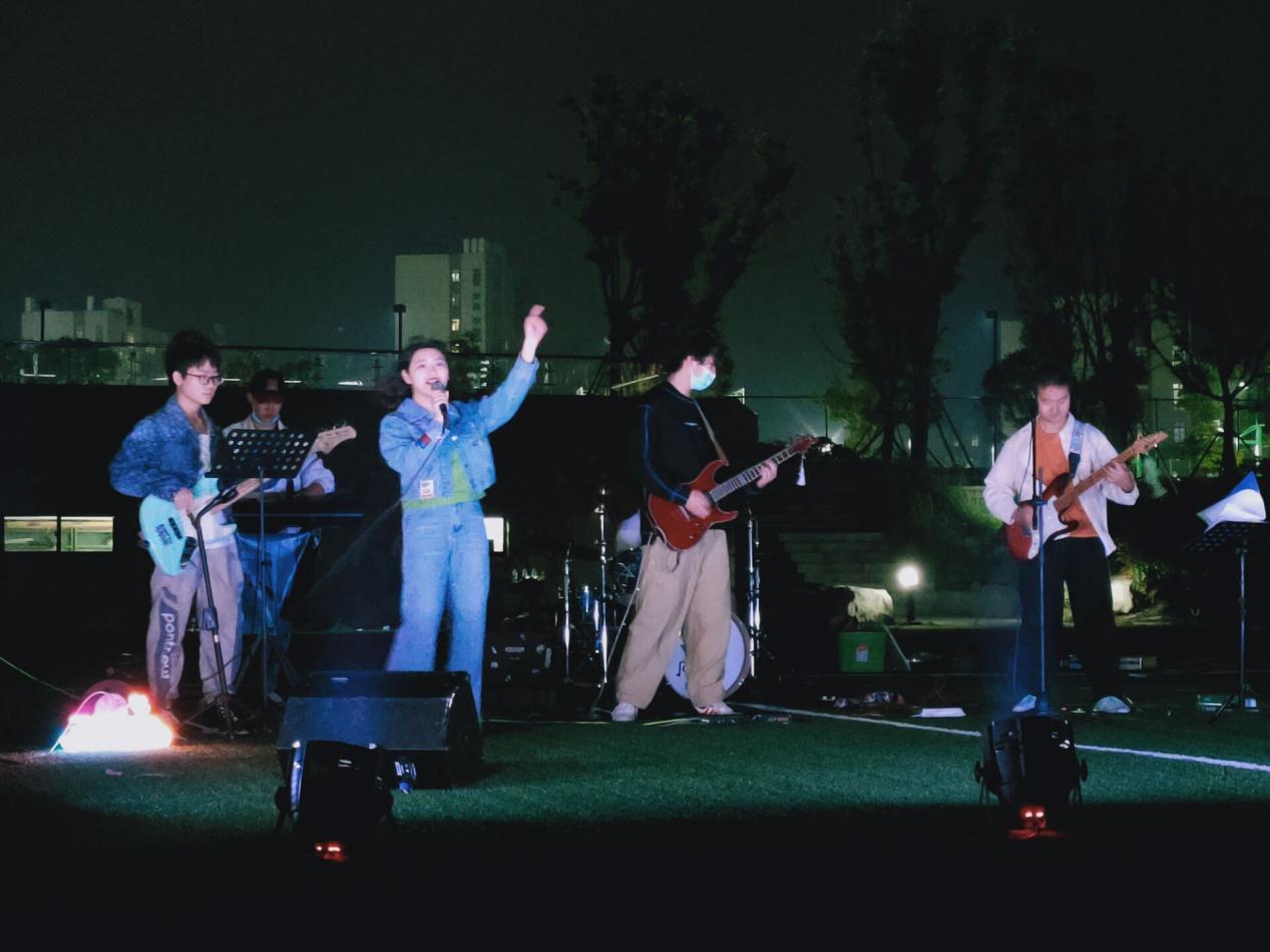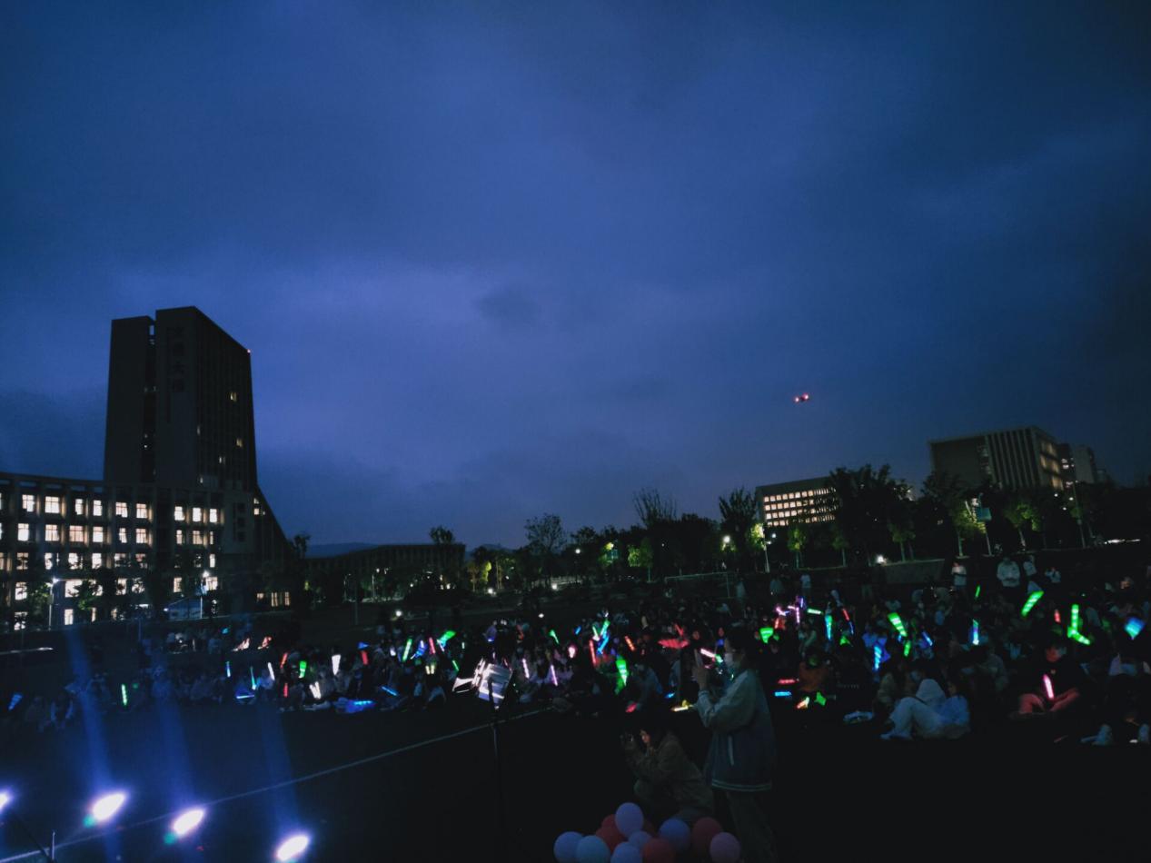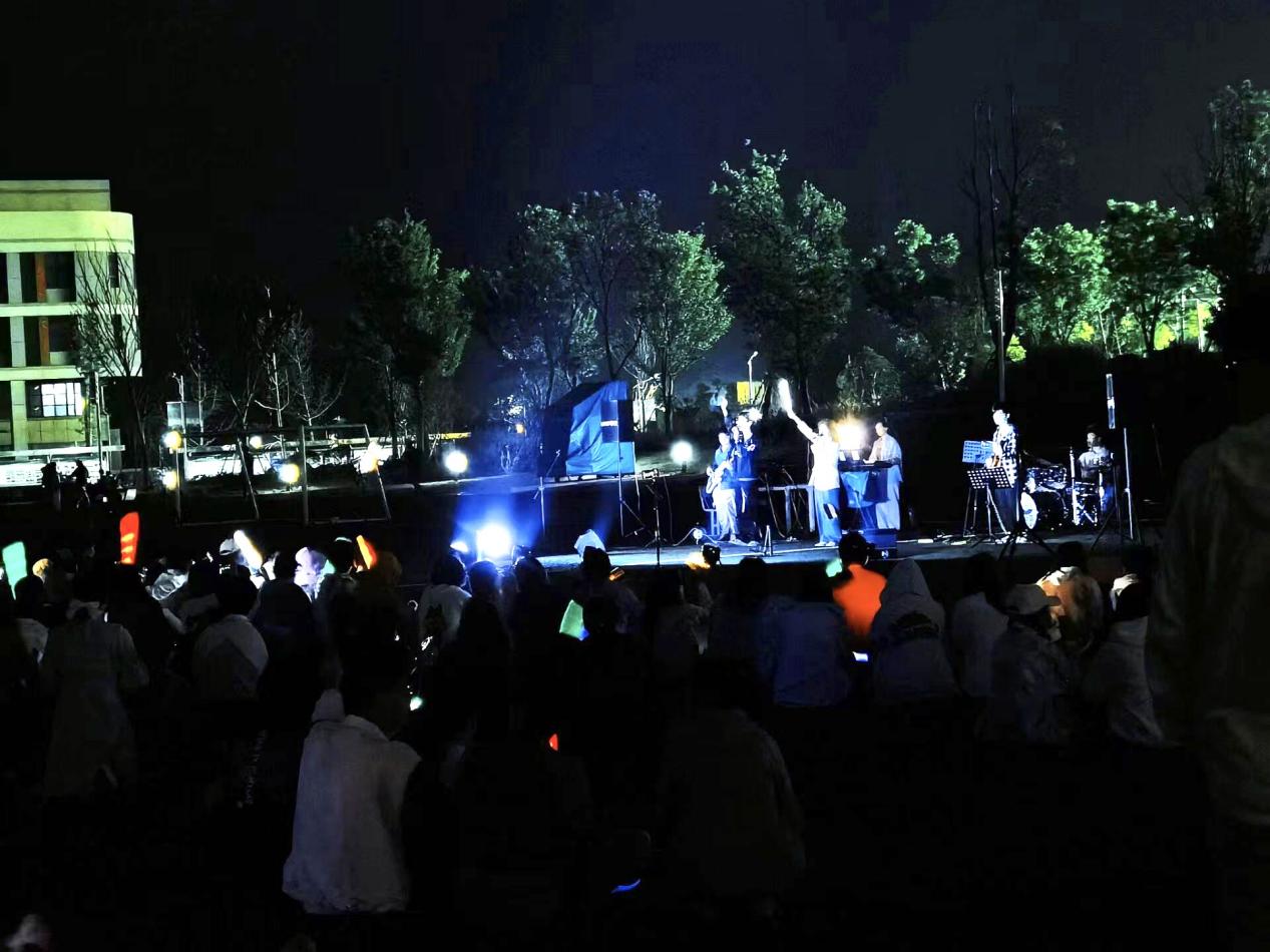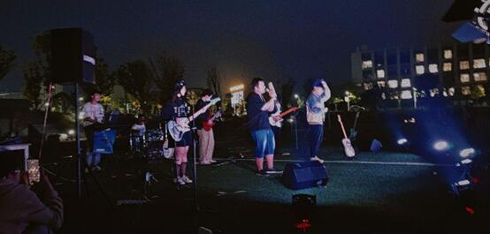 随后,JUST Dance街舞社的成员们带来了他们的表演,曼妙的舞姿配上铿锵的音乐点燃了现场同学的情绪。夜幕降临,工作人员在操场上打开地灯,黑夜中,乐队成员以及乐器在灯光的映衬下分外耀眼。接着由THEN-6乐队带来《Wherever you are》,《恋爱ing》,《河流》,《这世界那么多人》,现场观众都跟着挥舞荧光棒,跟着主唱一起唱起来。