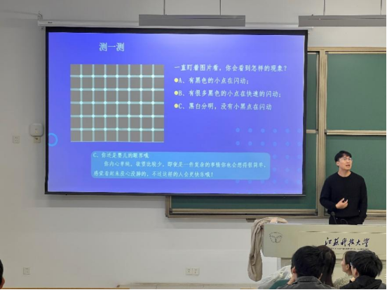 随后,他表达了自己对同学们的希望,要具有远大的志向,并对自己有一个正确的认识,做到自尊自爱,在认清自己之后正视现实、乐于交往,保持和谐的人际关系。最后,他向全体学生推荐了自我认知的相关视频、书籍与电影并解答了部分学生的提问。