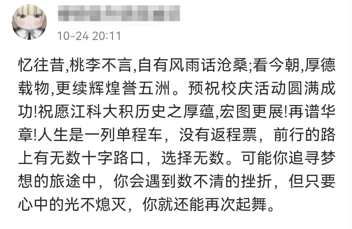 此次活动中同学们为母校献礼,写下属于自己对江科大的寄语,将“船魂”精神播撒至未来的自己和五洲四海;同学们热情参与校园知识答题,更加深入地了解母校,一齐见证了自己和母校的成长与变化。
