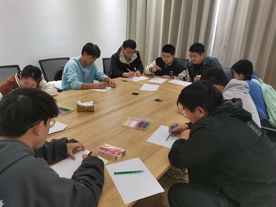 在第二个环节,每人分发到一张白纸,并选择了一支自己喜欢的彩笔,根据老师的指导,在纸上画出一幅图画以表达此刻的心情。绘画结束后,进行了两两一组,互相交换彼此的画作,然后根据画作猜一猜对方的心情,经过破冰游戏的各位心理委员褪去了最开始的羞涩积极发言。接着,王老师让心理委员们在刚刚的纸上从1到10,写出自己最近的情绪温度,最终8-10分的高分组有两人,4-7分的中分组有六人,0-3分的低分组有三人,按从高至低的排序,每位心理委员进行了发言,分享自己在这一周让自己开心或不开心的事。分享中,有人因为学业,有人因为家庭,还有人因为有暖心的舍友,在不断分享中不断学习到新的知识。在最后一个环节,王士凯老师用一队情侣吵架的原因,来为同学们解释了情绪ABC理论。现场的各位同学都表示通过老师专业化的讲解和各位同学的分享学会很多东西。