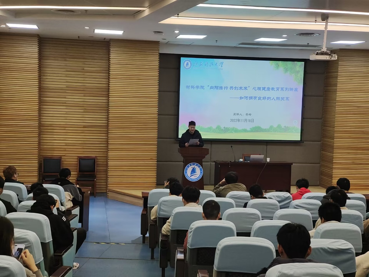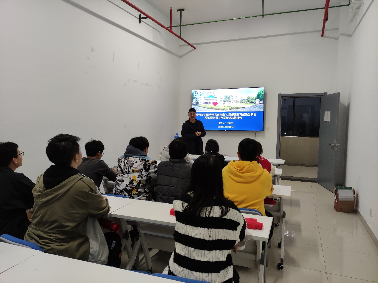 11月20日,材料学院“向阳携行,共创未来”心理健康教育成果分享会暨心理工作室工作报告会在材料学院539会议室举行。材料学院心理工作室负责人王远杰作2022年度心理健康教育工作报告,报告系统回顾了材料学院3月至11月开展的心理健康教育工作。报告指出,2022年材料学院围绕“向阳携行 共创未来”主题,举办生命教育、人际关系、情绪管理等心理活动,累计开展专家讲座5场,特色活动5场,团体辅导2次,主题班会2场,心理委员培训2次,心理分享会2次。