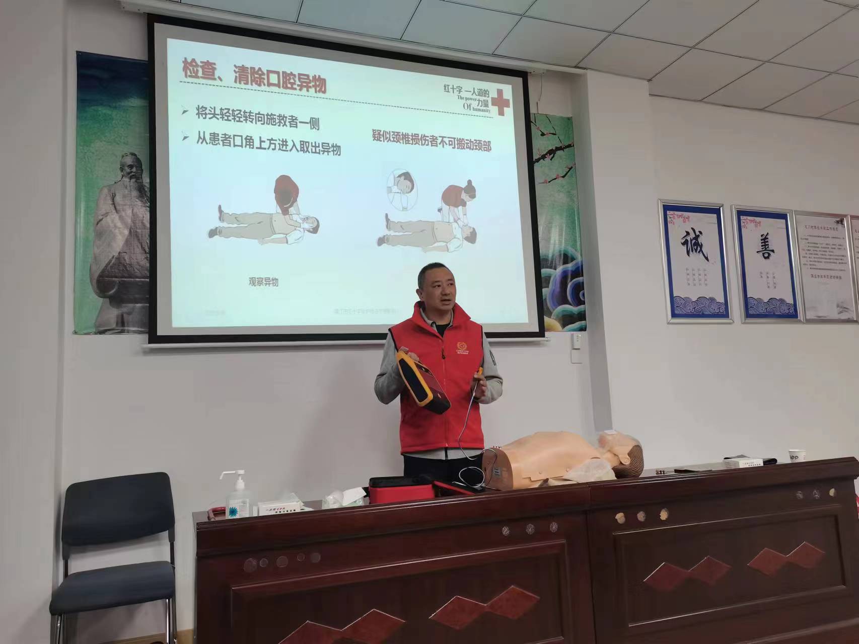 培训现场,培训老师向大家讲解了红十字运动的起源、现场救护的原则、方式,心肺复苏及AED急救技能,急救前的环境评估,现场施救应该注意的事项及规范的急救操作程序等方面的知识。通过理论和现场实际操作的方式,就如何判断救助者属于心肺复苏患者,胸外心脏按压、人工呼吸以及创伤救护等知识进行了详细演练,并指出了救助过程中容易出现的错误和问题。