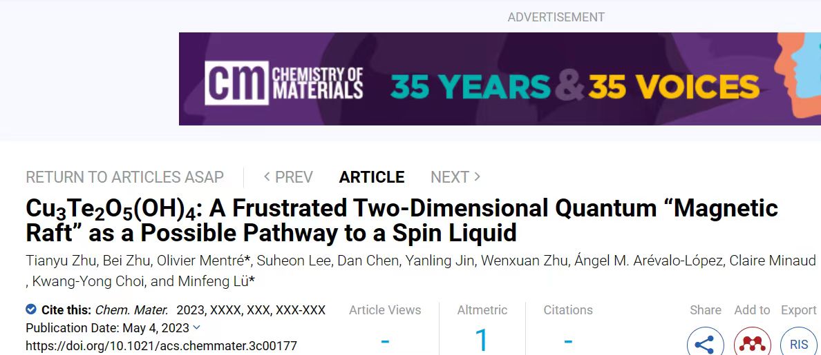 近期,材料学院磁学与量子材料团队在材料化学与物理领域国际顶级期刊Chem. Mater上在线发表了题为Cu3Te2O5(OH)4: A Frustrated Two-Dimensional Quantum “Magnetic Raft” as a Possible Pathway to a Spin Liquid的研究论文,报道了通过几何阻挫构建了二维量子“磁筏”在外加磁场调控性下的量子自旋液态行为。江科大材料学院为第一完成单位(版权单位)。2018级研究生朱田雨(现在中国科学院福建物构所何长振教授课题组攻读博士学位)和2017级研究生朱蓓为共同第一作者,材料学院吕敏峰教授与合作单位法国科学院固体化学与催化国家实验室Olivier Mentré教授为论文的通讯作者。该工作得到了国家自然科学基金等项目的资助。