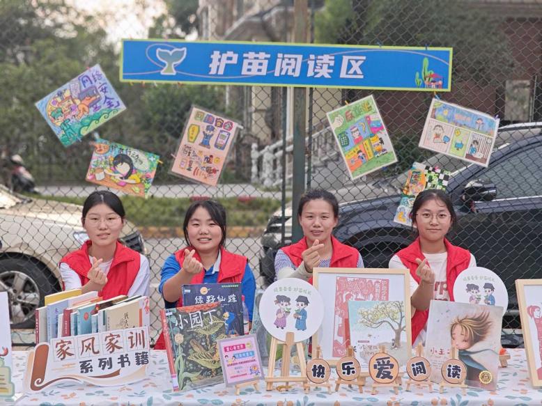 图为实践团成员王依婷同学在向社区推荐阅读书籍 王依婷供图